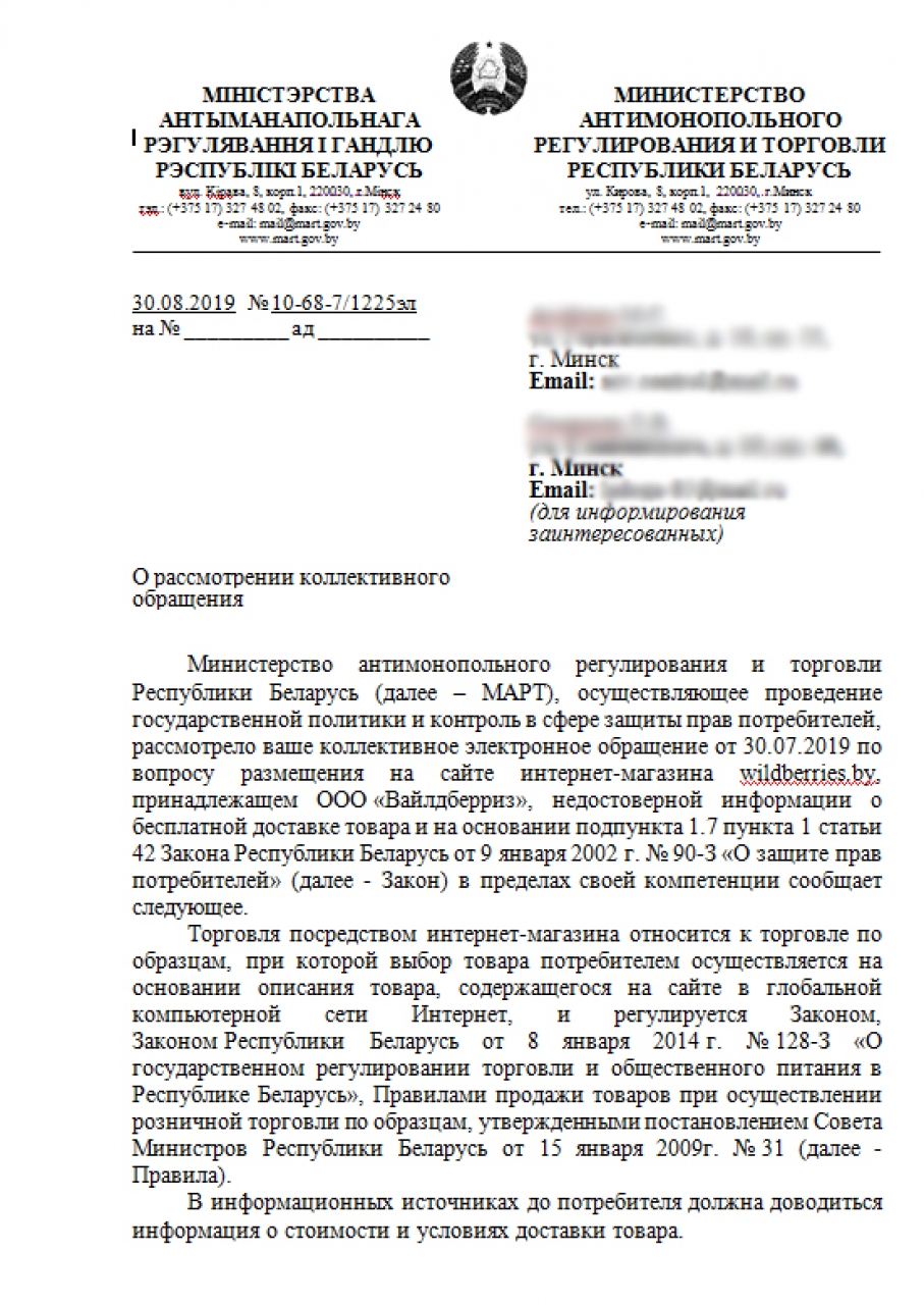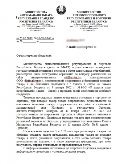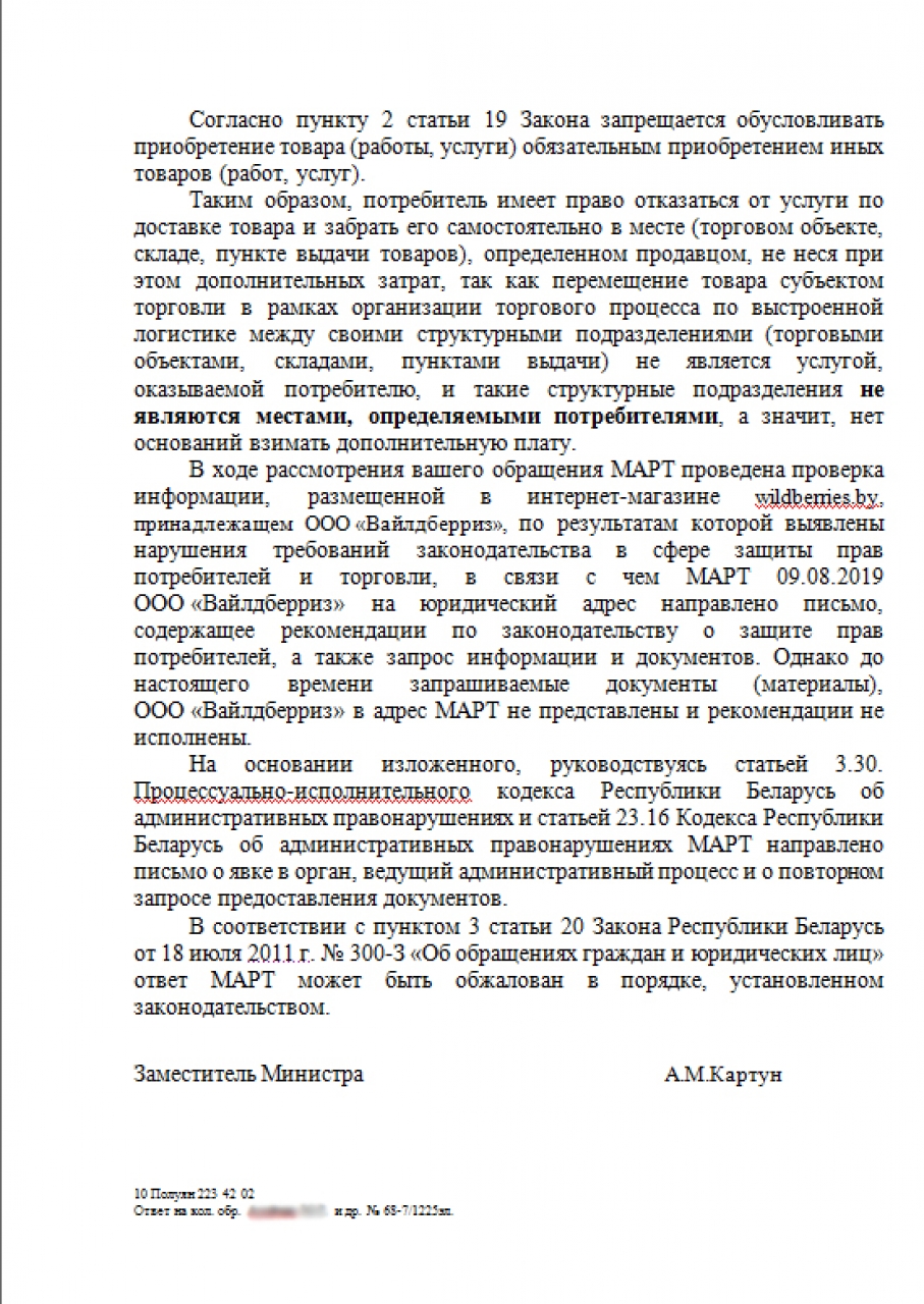 1. на основании вышеописанных обстоятельств и в пределах полномочий Министерства привести деятельность указанной торговой организации (ООО «Вайлдберриз», Беларусь) в части взимания оплаты за якобы оказываемую услугу по доставке товара в пункт самовывоза покупателями в полное соответствие с позицией Министерства по данному вопросу, а именно: прекратить нарушение магазином прав потребителей в связи со взиманием платы за доставку заказанного товара в пункт самовывоза для дальнейшего самостоятельного его получения покупателями;