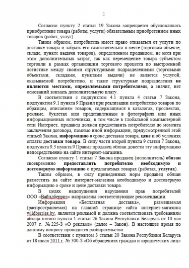 2. Среди прочего запросить у ООО «Вайлдберриз», (Беларусь) и проверить экономическое обоснование (в том числе калькуляцию) установленной стоимости якобы услуги по доставке товаров в пункт самовывоза - в размере 7 руб., в то время, как средняя стоимость даже индивидуальной курьерской доставки по г. Минску товаров на дом покупателю иными интернет-магазинами не превышает 5 BYN;