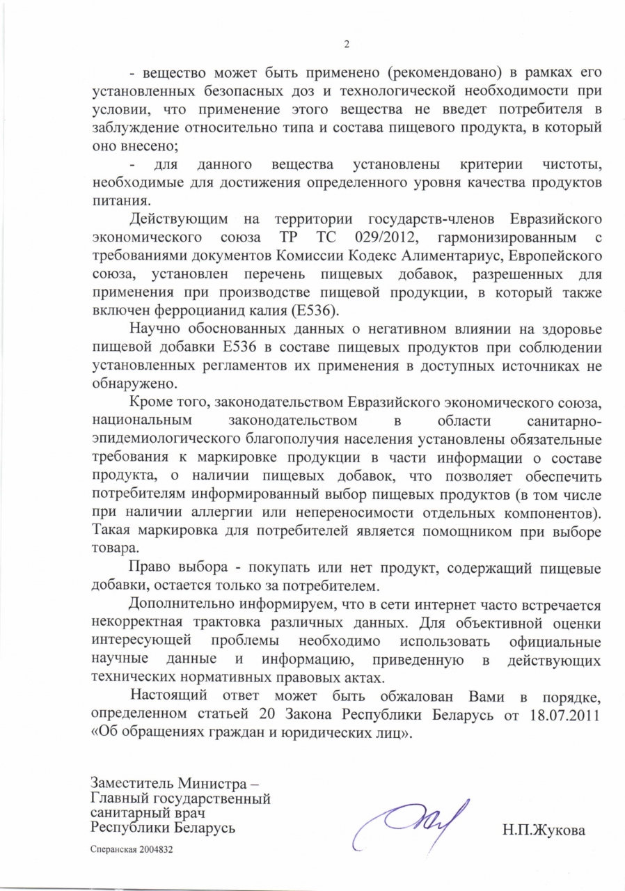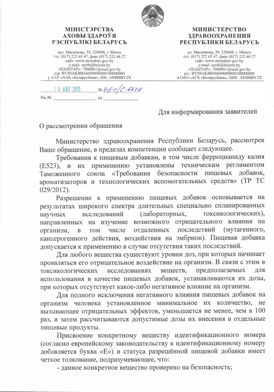 Мы, нижеподписавшиеся, на основании Положения о Министерстве здравоохранения, утвержденного Постановлением Совета Министров Республики Беларусь от 28.10.2011 N 1446, которым установлено, что основной задачей Минздрава является организация обеспечения санитарно-эпидемического благополучия населения Республики Беларусь, просим предпринять меры для скорейшего запрещения использования в пищевой промышленности Республики Беларусь добавки Е536 - ферроцианида калия, так как она несёт существенную угрозу здоровью (обратного не доказано), оказывает послабляющий эффект, вызывает болевые ощущения в кишечнике, и по этой причине запрещена к использованию в ряде стран.