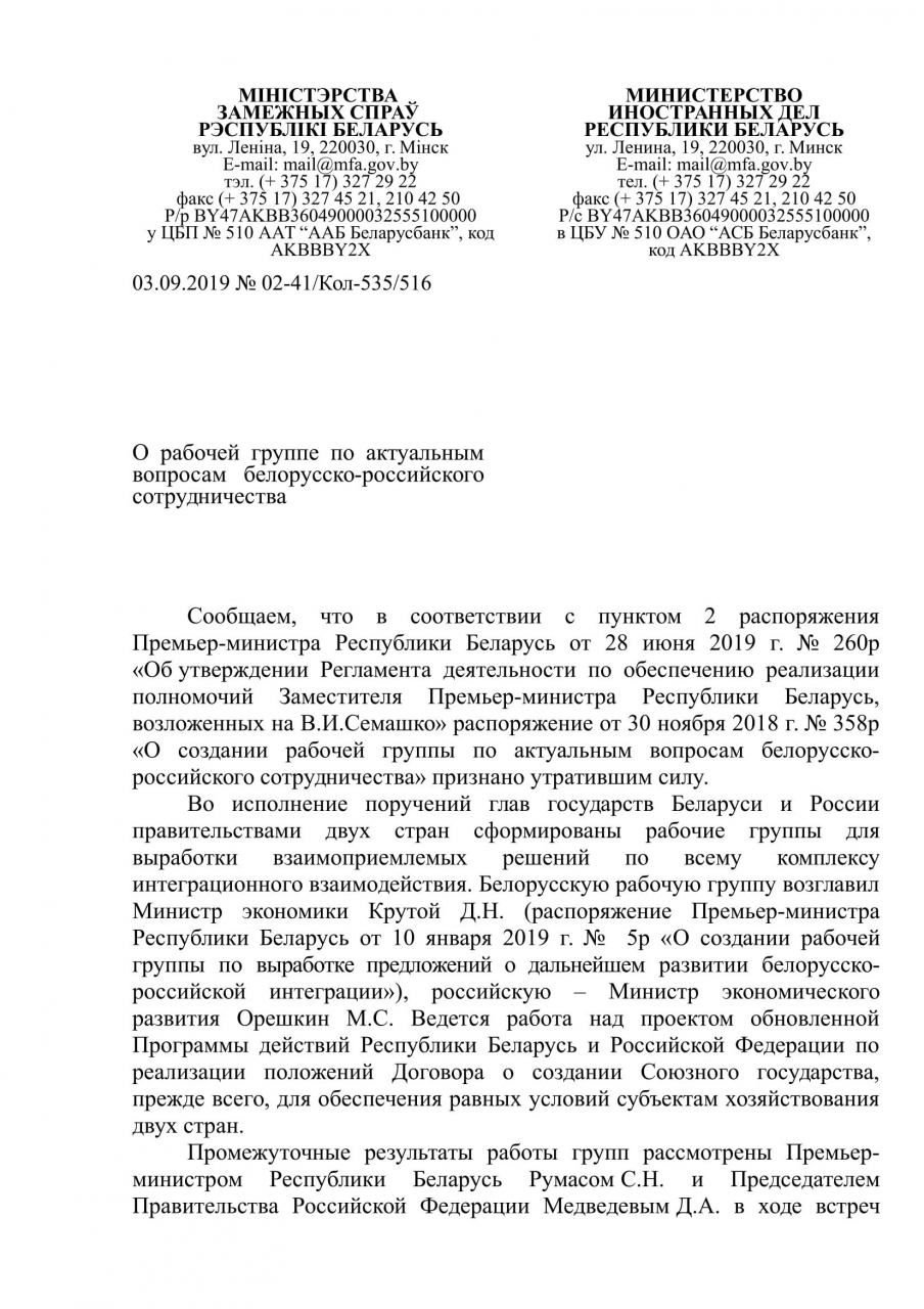 Распоряжением Премьер-министра Республики Беларусь от 30 ноября 2018 года №358р "О создании рабочей группы по актуальным вопросам белорусско-российского сотрудничества" была создана рабочая группа в составе 17 чиновников по актуальным вопросам белорусско-российского сотрудничества.