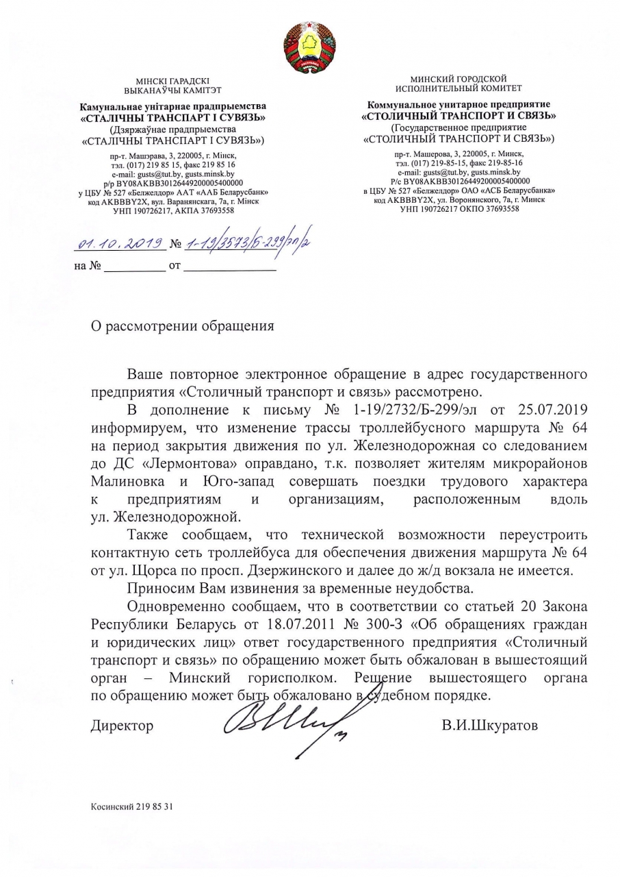 В связи с вышеописанными обстоятельствами просим пояснить почему нельзя проложить маршрут троллейбуса №64 до остановки "Музыкальный театр" и далее до ул.Бобруйской? Это было бы логично и рационально, нежели, по сути, уничтожать маршрут.