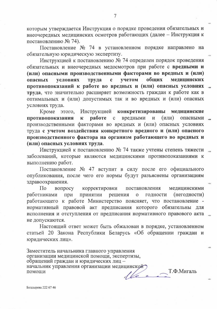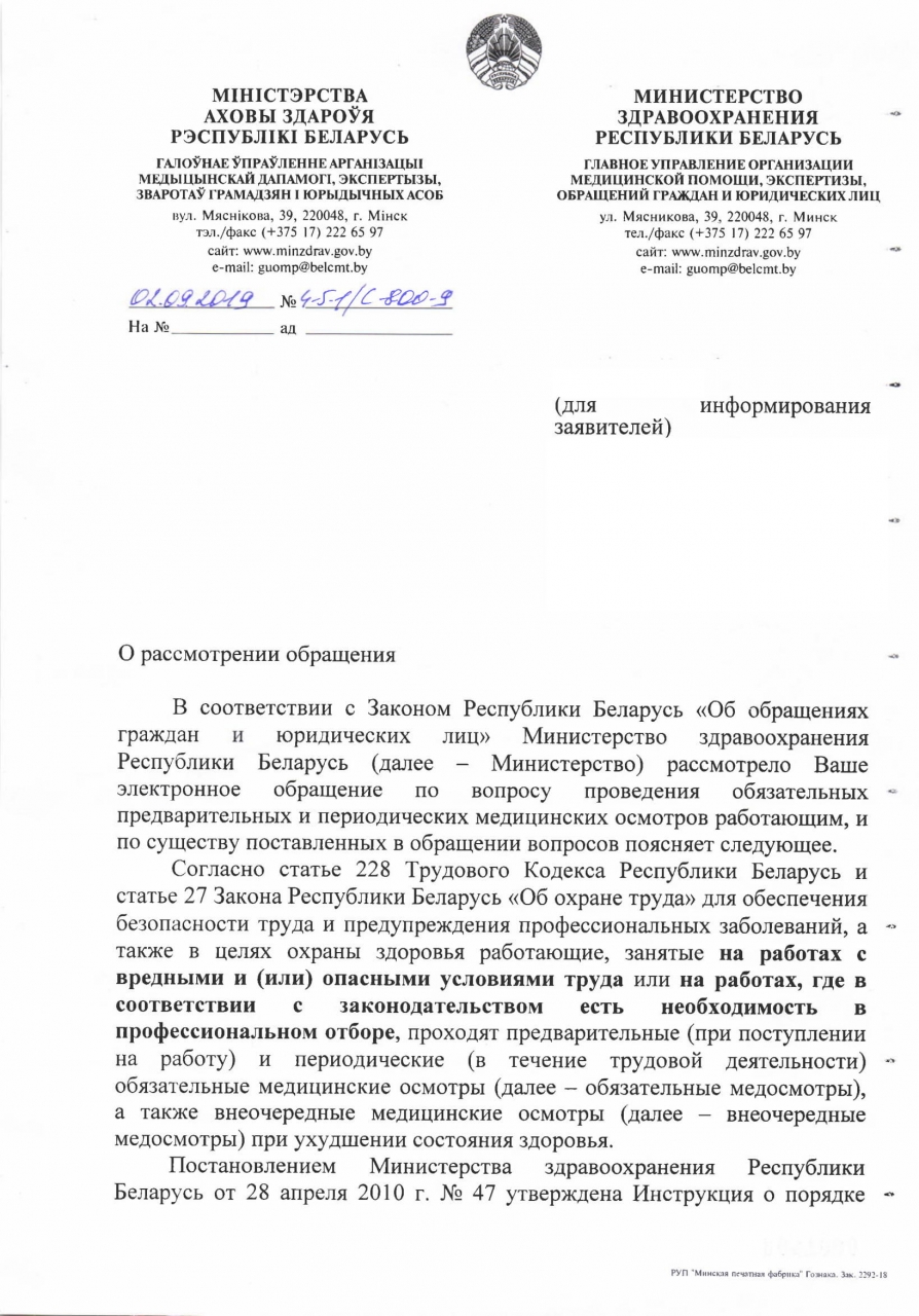Мы, нижеподписавшиеся, находим, что Постановление Министерства здравоохранения от 28.04.2010 N 47 "Об утверждении Инструкции о порядке проведения обязательных медицинских осмотров работающих и признании утратившими силу некоторых постановлений Министерства здравоохранения Республики Беларусь" (далее - Постановление) нуждается в доработке, потому что оно слишком однобокое, предвзятое, и не учитывает множество особенностей.