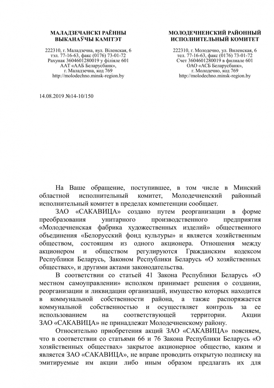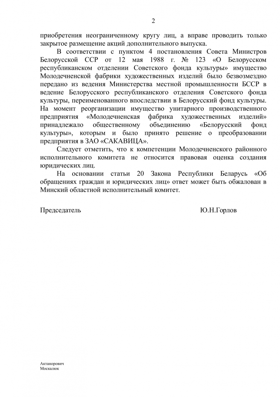 На момент реорганизации имущество унитарного производственного предприятия «Молодечненская фабрика художественных изделий» принадлежало общественному объединению «Белорусский фонд культуры», которым и было принято решение о преобразовании предприятия в ЗАО «САКАВИЦА».