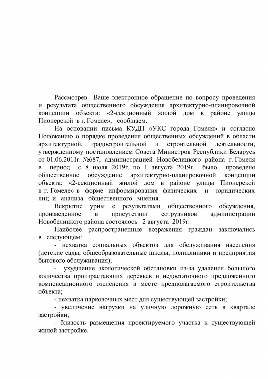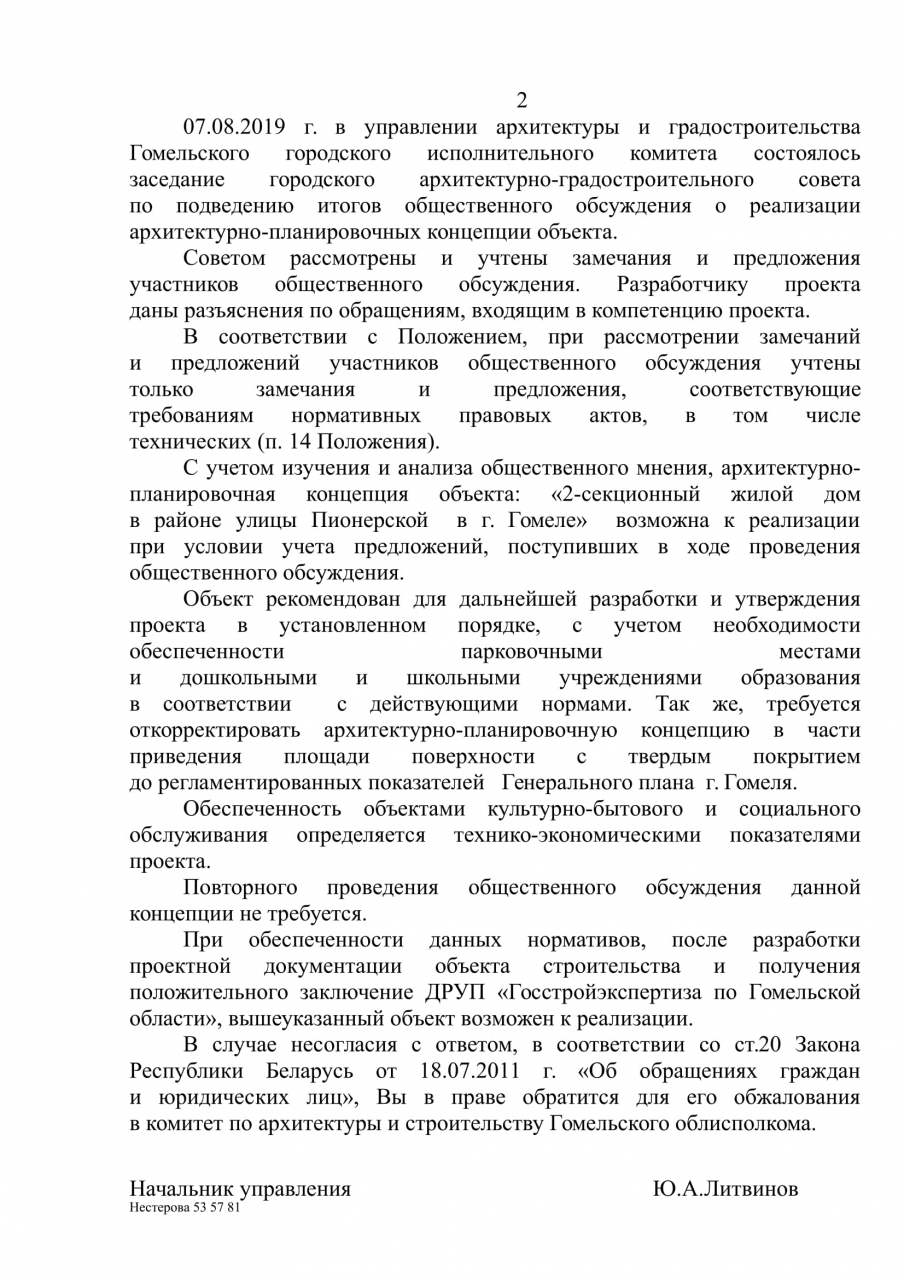 - архитектурно-планировочную концепцию объекта строительства: «2-секционный жилой дом в районе улицы Пионерской в г.Гомеле» признать нецелесообразной и отклонить ее.