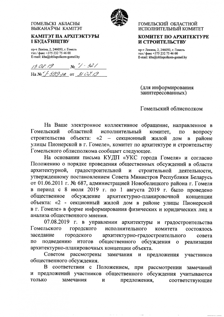 В настоящее время до 01.08.2019 проводится общественное обсуждение архитектурно-планировочной концепции объекта строительства: «2-секционный жилой дом в районе улицы Пионерской в г.Гомеле».