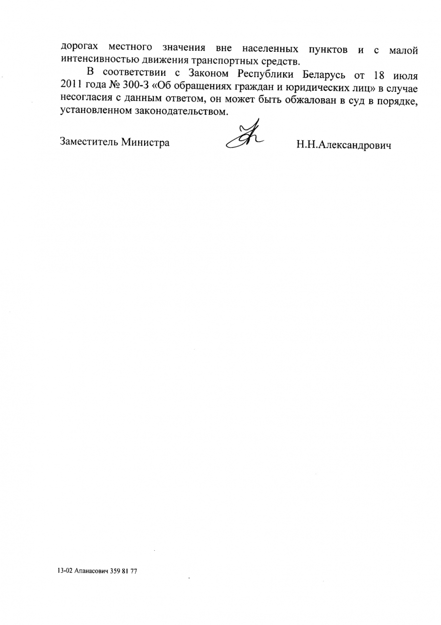Далее, по нашему мнению, не соответствует действительности сведения о том, что при соблюдении скоростного режима на дорогах, покрытых гравием и битумом, не наносится вред транспортным средствам. Наоборот, машины изрешечены гравием, заляпаны битумом, при этом, если даже ехать не более 40 км/ч, битум залетает до самых стёкол. Однако компенсировать автовладельцам ущерб, нанесённый битумом и гравием, РУП "Белдорцентр" согласия не даёт.