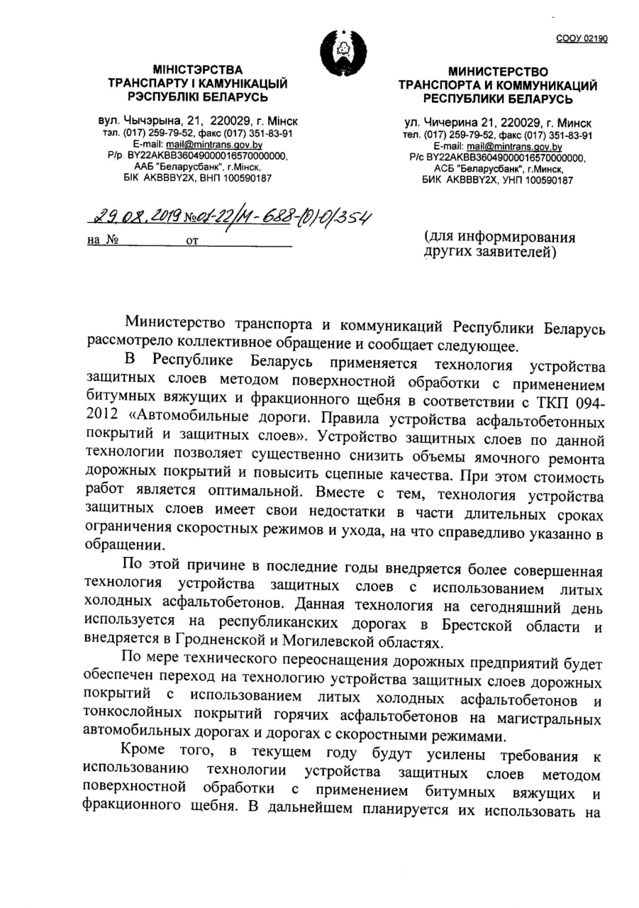 Ответ РУП "Белдорцентр" мы находим необоснованным, поскольку в качестве аргументов для осуществления ремонта дорог методом поверхностной обработки с применением битумных вяжущих РУП "Белдорцентр" указывает опыт других стран по использованию данного метода. Мы считаем, что при подобной ссылке не учитываются особенности дорожного движения, состояния дорог в Республике Беларусь, по отношению к тем же показателям в других странах.