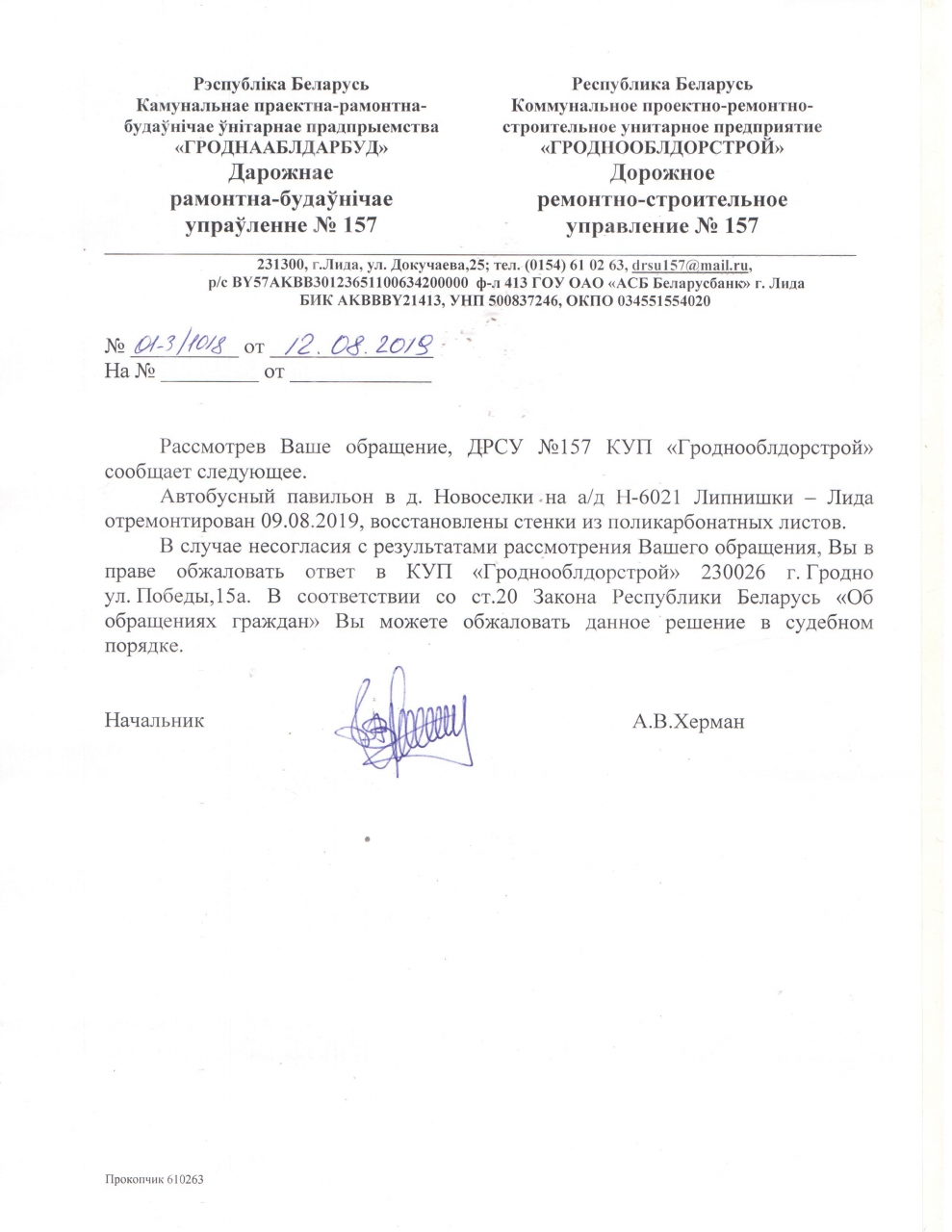 Руководствуясь ст.41 Закона "О местном управлении и самоуправлении в Республике Беларусь", которая устанавливает, что исполкомы в пределах своей компетенции организуют работу по благоустройству территорий населенных пунктов и создают условия для предоставления транспортных услуг населению, просим благоустроить остановочный пункт в деревне Новосёлки "Новосёлки - Лида", обустроив его ветрозащитой.