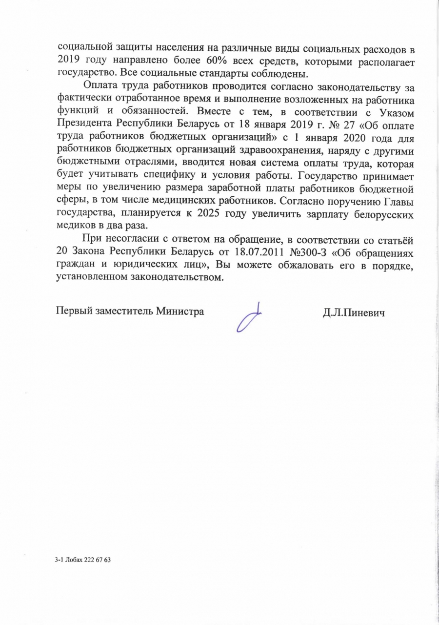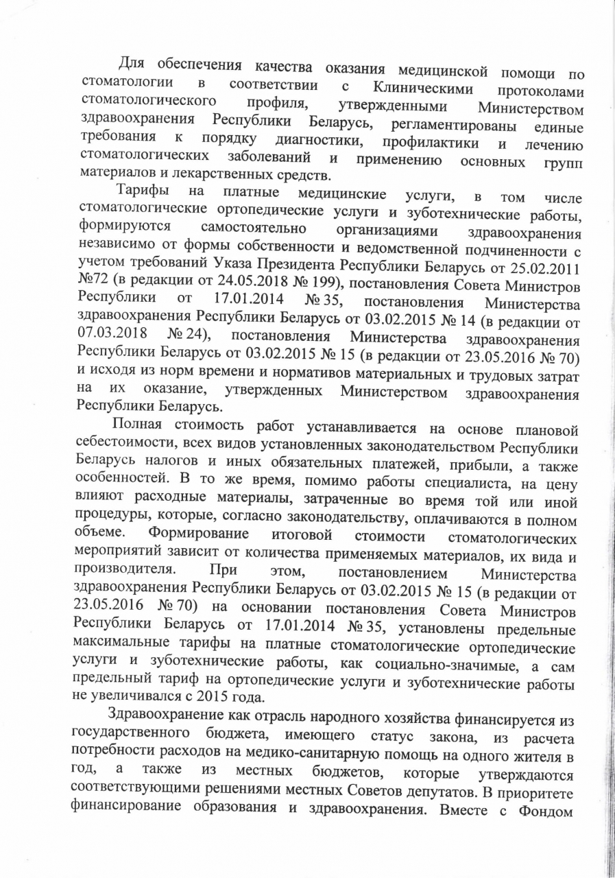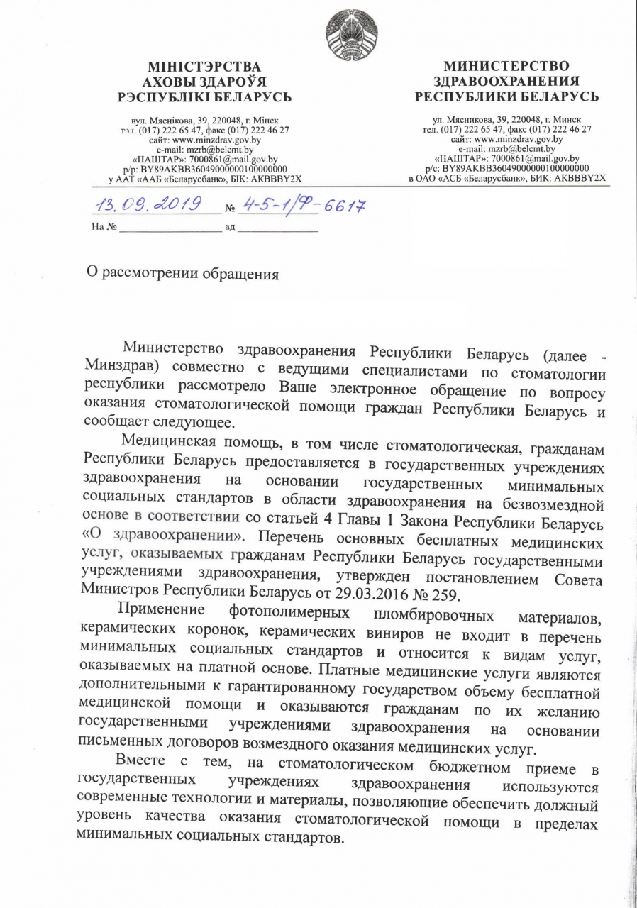 В связи с этим на основании Положения о Министерстве здравоохранения, утвержденного Постановлением Совета Министров Республики Беларусь от 28.10.2011 N 1446, которым установлено, что основной задачей Минздрава является организация оказания медицинской помощи населению Республики Беларусь, крайне убедительно просим увеличить финансирование данной сферы медицинских услуг, предпринять меры для уменьшения их стоимости для граждан, увеличить зарплаты стоматологам. Качественные стоматологические процедуры сделать бесплатными, или хотя бы их часть, для того, чтобы пациент не стоял перед выбором: сделать бесплатно или дёшево — некачественно и плохо, или сделать хорошо и качественно, но дорого и в кредит.