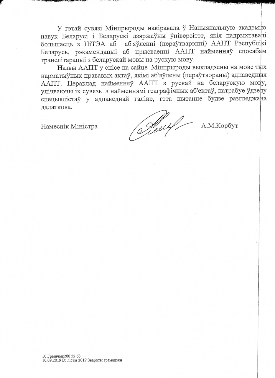 Мiнпрыроды накiравала ў Акадэмiю навук i БДУ рэкамендацыi аб аб`яўленнi (пераўтварэннi) асаблiва ахоўваемых прыродных тэрыторый (ААПТ) i аб прысваеннi iм найменняў спосабам транслiтарацыi з беларускай мовы на рускую. Пераклад найменняў ААПТ з рускай на беларускую мову патрабуе ўдзелу спецыялiстаў у адпаведнай галiне, гэтае пытанне будзе рагледжана дадаткова.