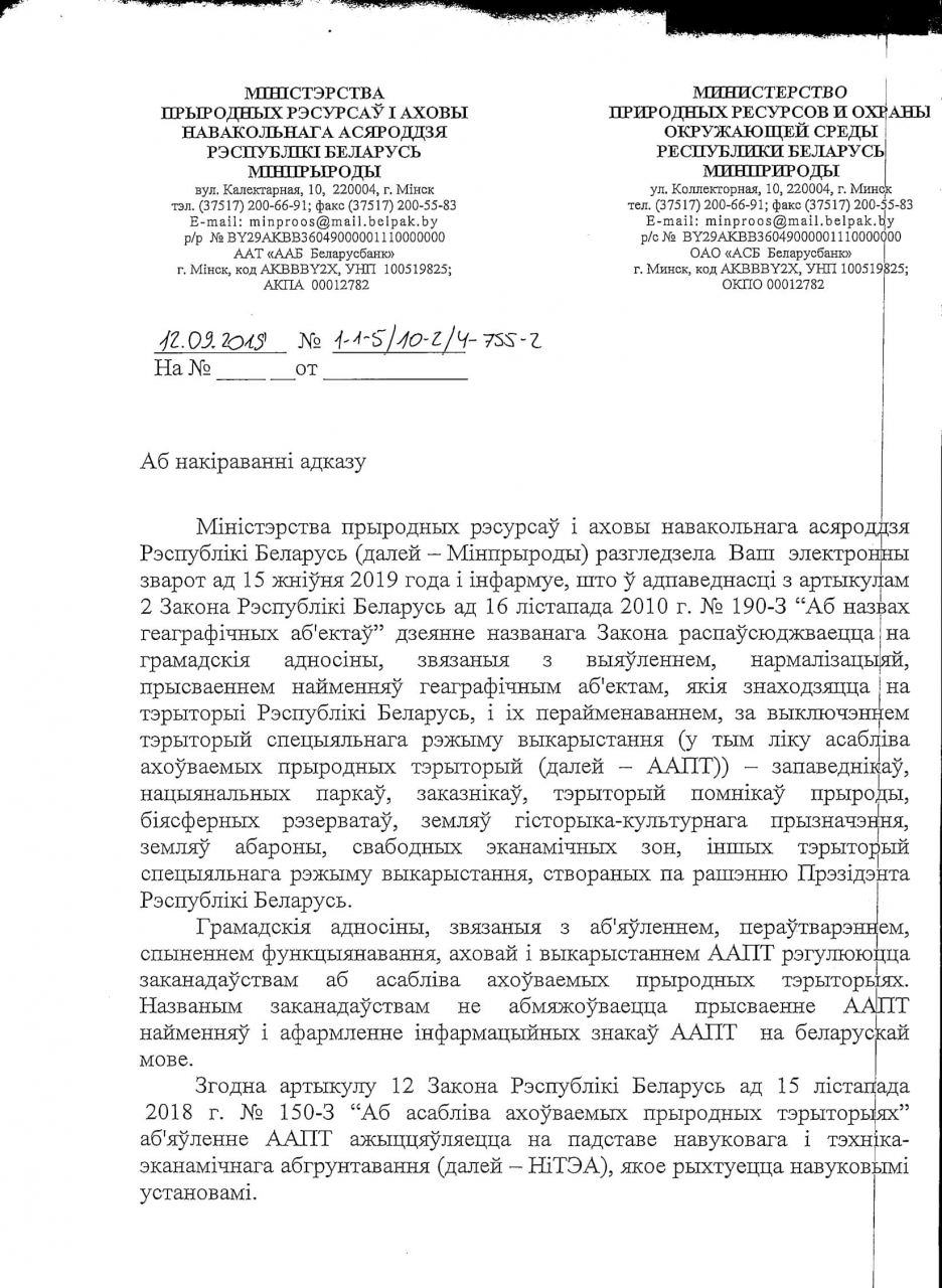Таксама просім дапоўніць спісы прыродаахоўных тэрыторый на сайце Міністэрства прыродных рэсурсаў і аховы навакольнага асяроддзя Рэспублікі Беларусь беларускімі назвамі, удакладненымі ў мясцовых органаў улады, бо "аматарскі" пераклад існуючых назваў можа быць не заўсёды правільны праз адсутнасць націку ў рускай назве і варыятыўнасць перакладу некаторых геаграфічных тэрмінаў на беларускую мову.