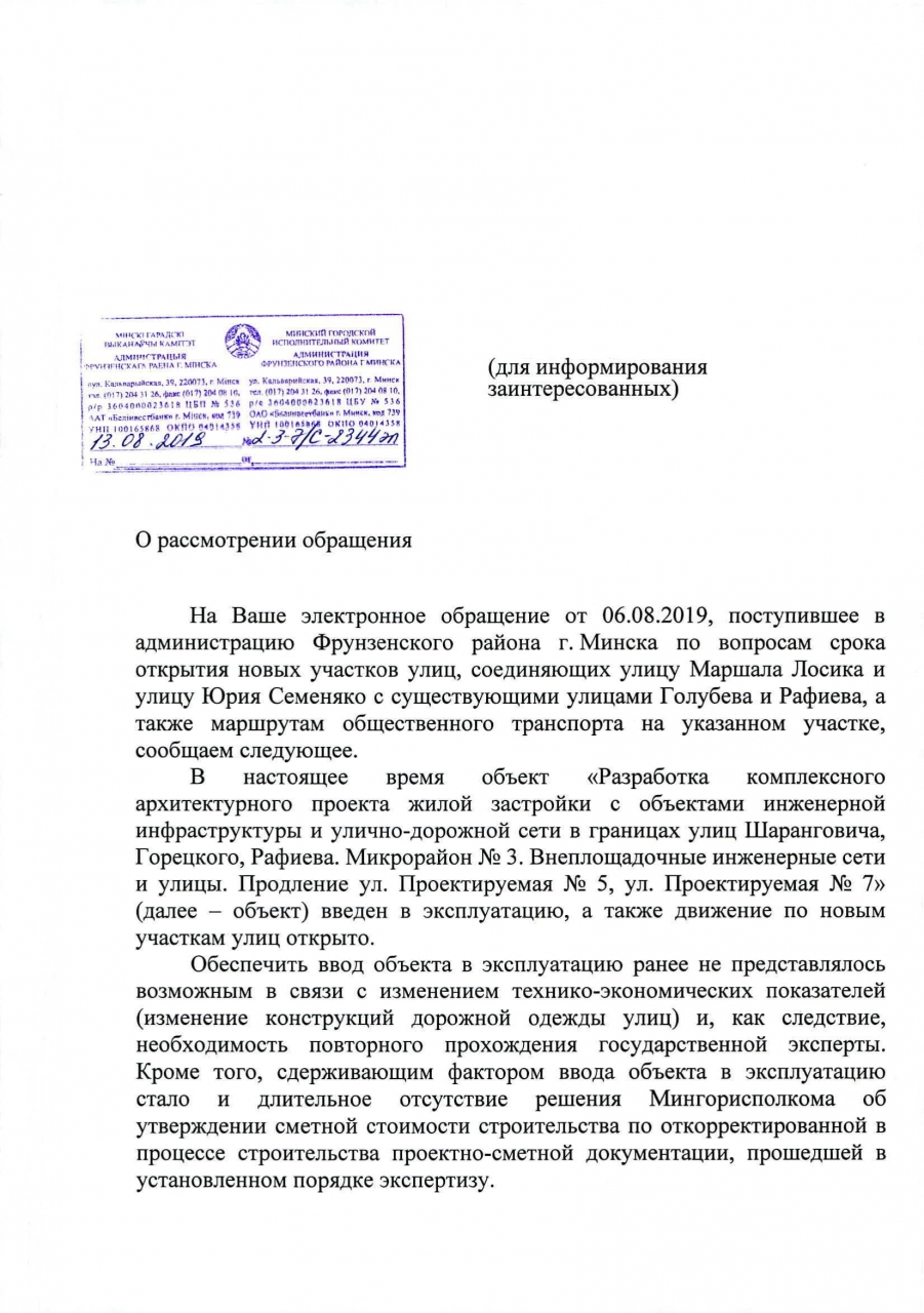 Объект "Разработка комплексного архитектурного проекта жилой застройки с объектами инженерной инфраструктуры и улично-дорожной сети в границах ул.Шаранговича, Горецкого, Рафиева. Микрорайон №3. Внеплощадочные инженерные сети и улицы. Продление ул.Проектируемая №5, ул.Проектируемая №7" введён в эксплуатацию, а также движение по новым участкам улиц открыто. По вопросу маршрута движения общественного транспорта на указанном участке направлено обращение в КУП "Минсктранс" и ГУ "Столичный транспорт и связь".