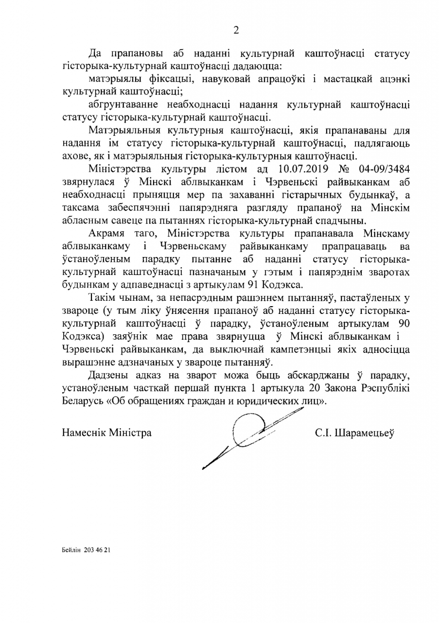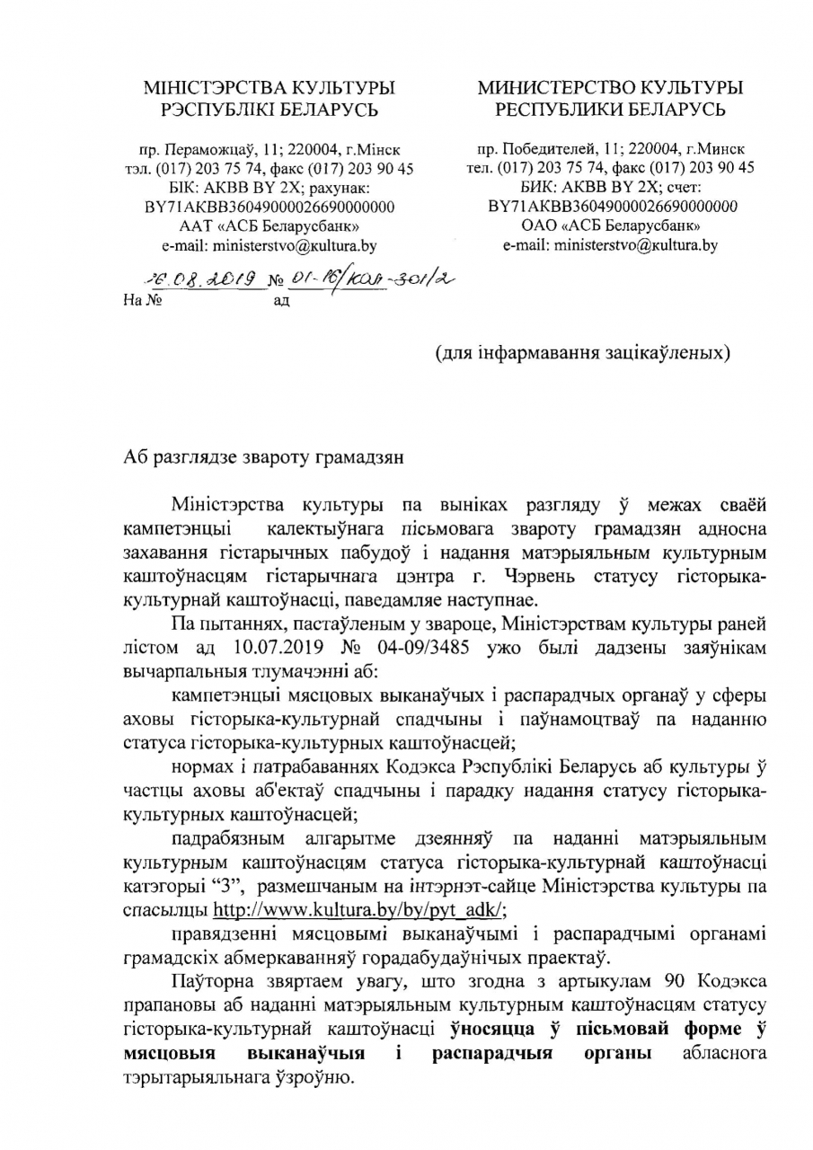 Але найбольш уражвае тое, як Мінаблвыканкаме перакручваюць Кодэкс аб культуры, адказваючы на прапанову надаць шэрагу гістарычных будынкаў статус гісторыка-культурнай каштоўнасці. Так, спасылаючыся на пункт 2 артыкула 92 вышэйзгаданага Кодэкса, сцвярджаецца, што «статус гісторыка-культурнай каштоўнасці можа быць нададзены нерухомай матэрыяльнай каштоўнасці пры ўмове, што яна з'яўляецца аўтэнтычнай або рэстаўраванай у адпаведнасці з навукова-праектнай дакументацыяй на выкананне рамонтна-рэстаўрацыйных работ на матэрыяльных гісторыка-культурных каштоўнасцях.», пры гэтым, на думку чыноўнікаў выканкама, пералічаныя ў папярэднiм звароце будынкі ў Чэрвені ў ходзе шматлікіх рамонтаў падвергліся значным змяненням, сярод якіх "страчаны многія аўтэнтычныя элементы (Якія? Дзе? Сумніўна, што праводзілася нейкае навуковае ці натурнае даследванне), праведзена замена вокнаў і дзвярных блокаў, будынак аддзела ЗАГС рэканструяваны, у будынку гімназіі праведзены сучасныя рамонтныя работы і іншае." Як бачым, усё вельмі абстрактна. Што змянілі "сучасныя рамонтныя работы" і рэканструкцыя? Знішчылі дашчэнту будынкі ці толькі падвясныя столі навесілі? Чым займаецца аддзел архітэктуры райвыканкама, што ў яго пад носам (і з ягонай пісьмовай згоды) працягваецца дэградацыя гістарычнай забудовы? Адказу няма.