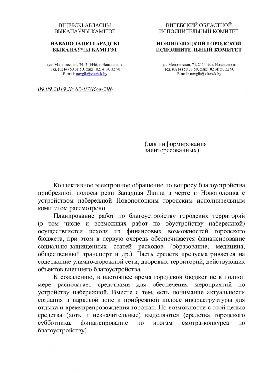 Город Новополоцк расположен на берегу реки Западная Двина, вместе с тем, территория возле реки не благоустроена должным образом, за исключением Парка культуры и отдыха.