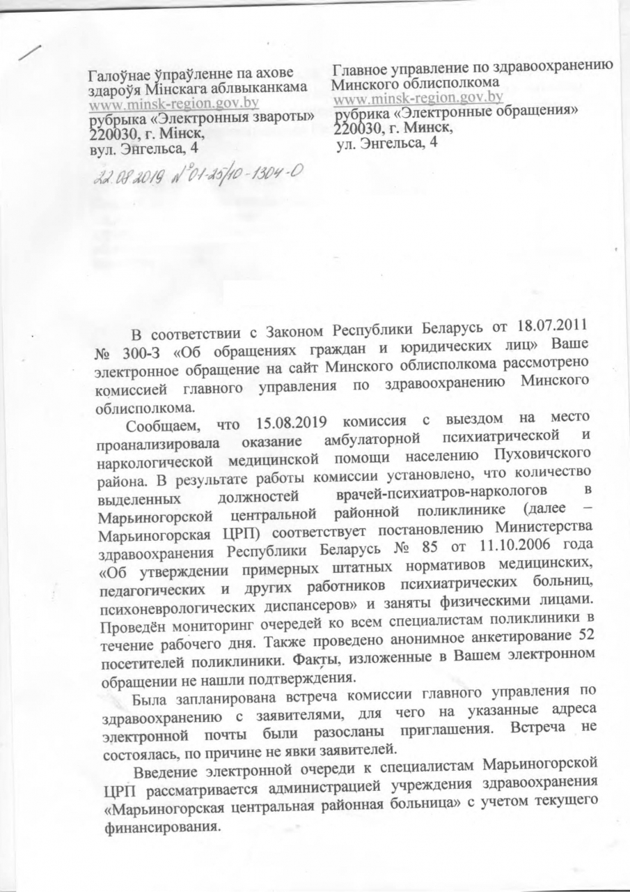 На основании изложенного, просим внедрить систему электронной очереди в Марьиногорской центральной районной поликлинике, как это уже сделано в поликлиниках Минска.