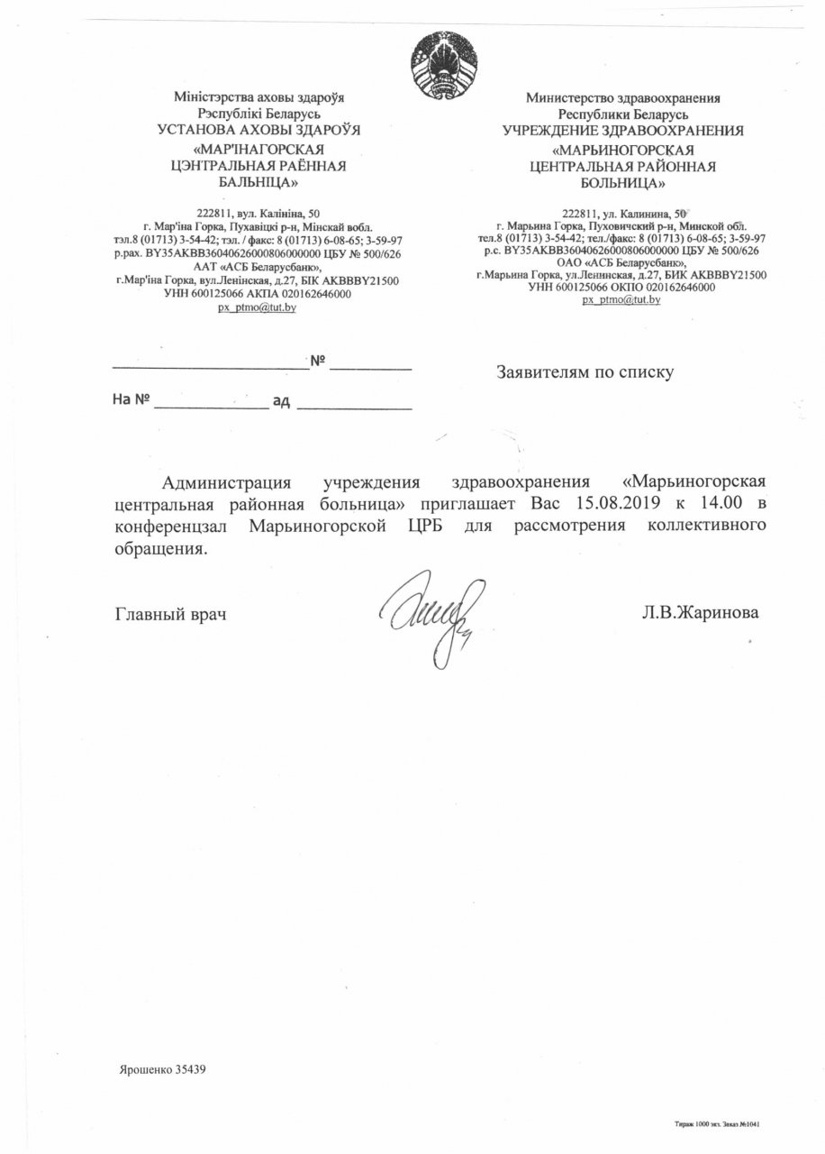 15 августа в 14:00 в конференц-зале УЗ "Марьиногорская центральная районная больница" состоится собрание по рассмотрению коллективного обращения.
