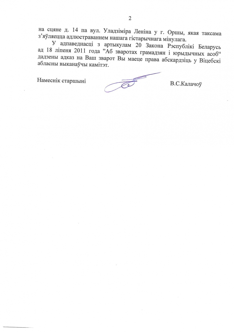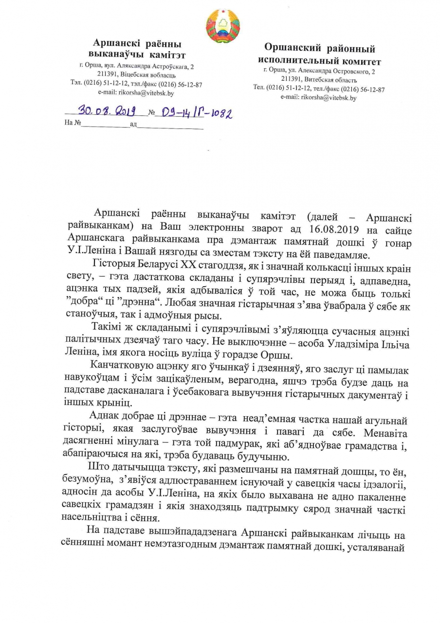 Патрабуем дэмантаваць памятную дошку ў гонар У.І. Леніна ў Воршы па адрасу вул.Леніна 14. Данная асоба з’яўляецца вельмі супярэчлівай. Дзякуючы якой беларускі народ быў падзелены ў 1921 годзе паводле Рыжскай дамовы. Пад яго кіраўніцтвам праводзілася палітыка “Чырвонага тэрору”, вынікам якой стала фізічнае знішчэнне вялікай колькасці людзей.