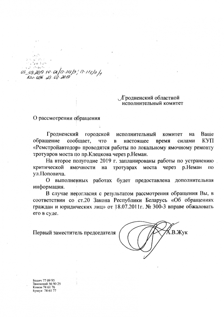 В настоящее время проводятся работы по локальному ямочному ремонту тротуаров моста по пр.Клецкова через р.Неман. На второе полугодие 2019 г. запланированы работы по устранению критической ямочности на тротуарах моста через Неман по ул.Поповича.