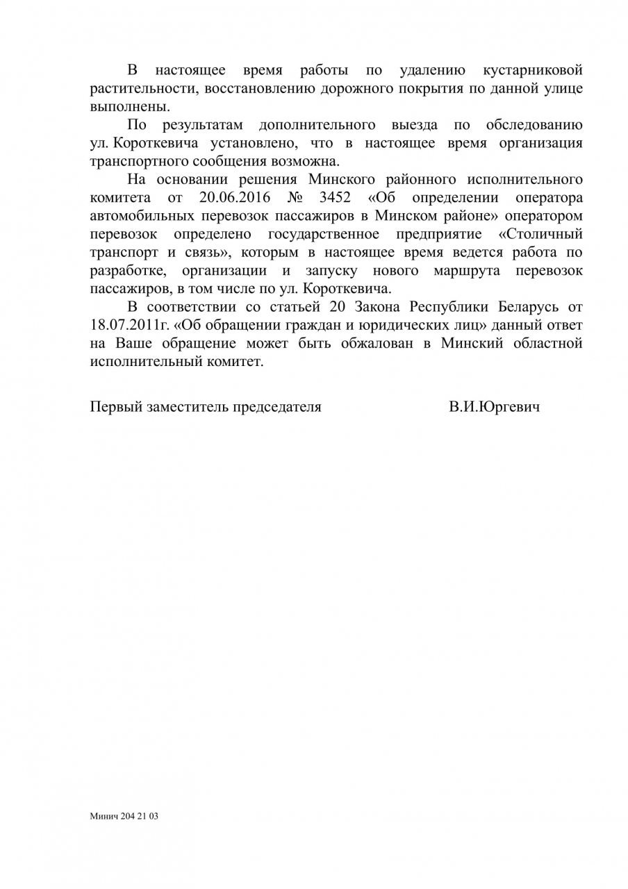 В связи с изложен этим убедительно просим рассмотреть возможность организации автобусного сообщения по улице Короткевича.