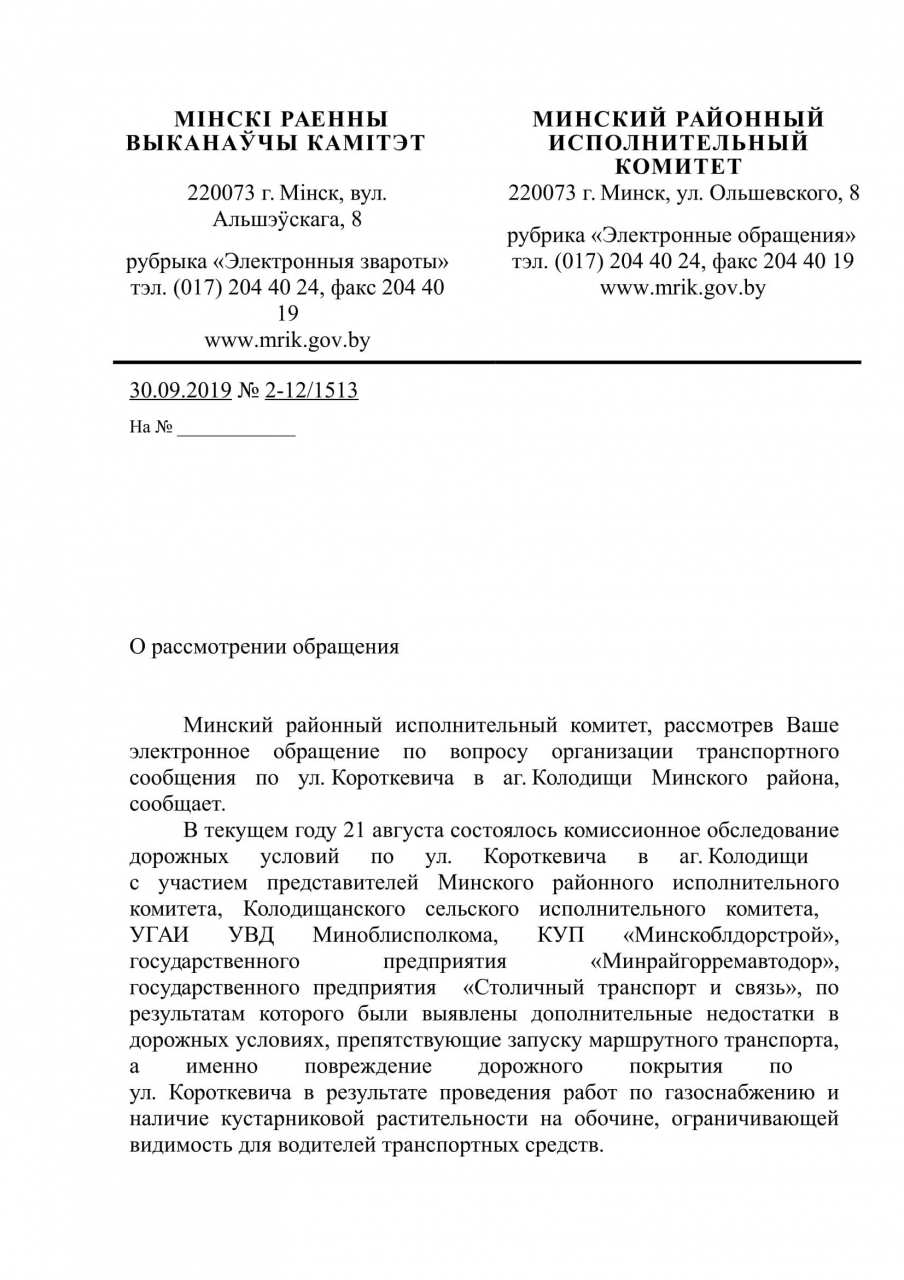 В 2017 году в соответствии с планом мероприятий по комплексному благоустройству агрогородка Колодищи на 2017-2019 годы была заасфальтирована ул.Короткевича. На различных встречах населения с представителями разных уровней власти этот вопрос (организация автобусного движения по улице Караткевича) неоднократно поднимался. Жители агрогородка неоднократно обращались по горячим линиям, с помощью электронных обращений в компетентные государственные органы, однако вопрос так и не был решён.