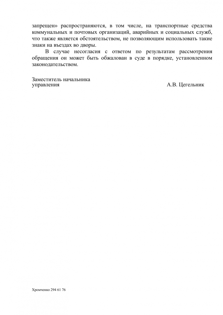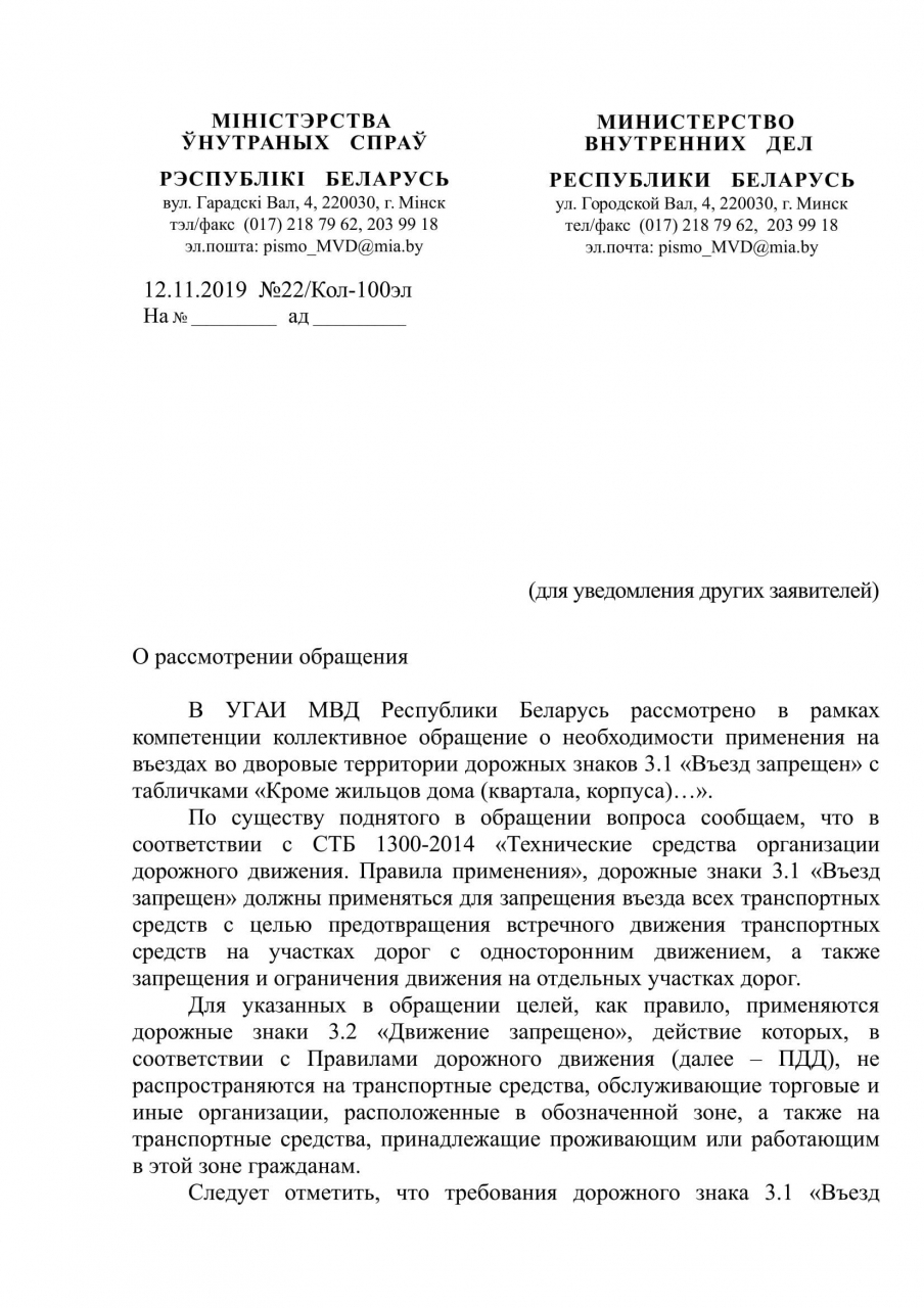 В целях совершенствования, оптимизации и очистки дворовых территорий от посторонних автомобилей, в городах Республики Беларусь, включая Минск, указываем на необходимость установки на въездах во дворы жилых домов дорожного знака 3.1 "Въезд Запрещен" и информационно-указательной таблички "Кроме жильцов дома/квартала/корпуса". (Положения о Министерстве внутренних дел Республики Беларусь, утвержденного Указом Президента Республики Беларусь от 04.12.2007 N 611; которое устанавливает, что МВД в пределах своей компетенции и в соответствии с законодательством обобщает практику применения законов и иных нормативных правовых актов, организует и осуществляет контроль за соблюдением законодательства в области дорожного движения и обеспечения его безопасности).