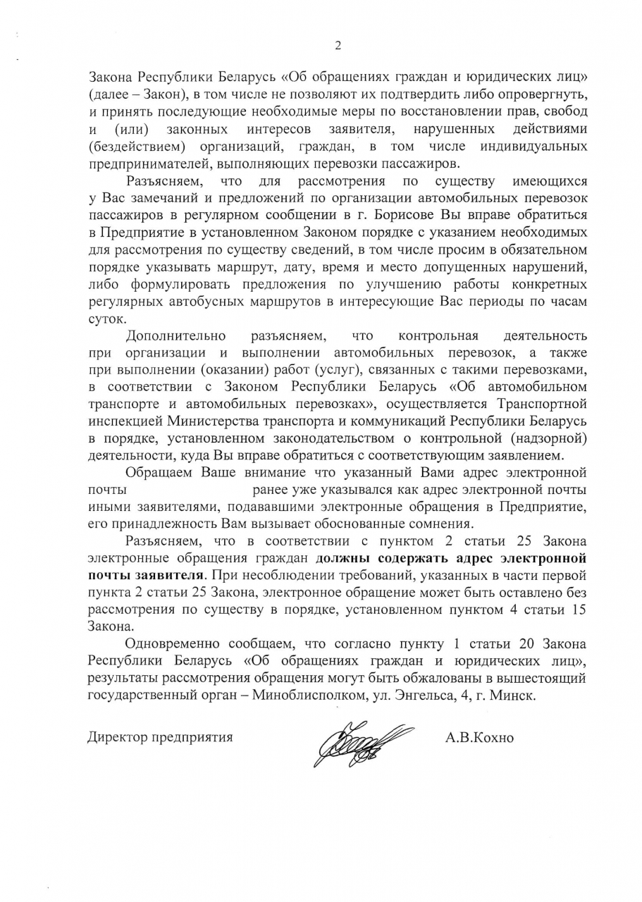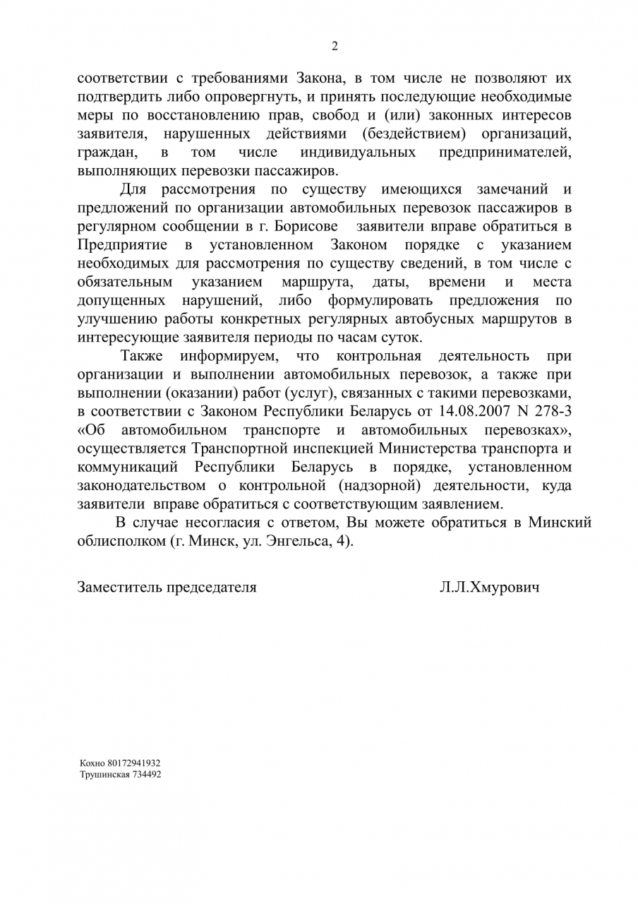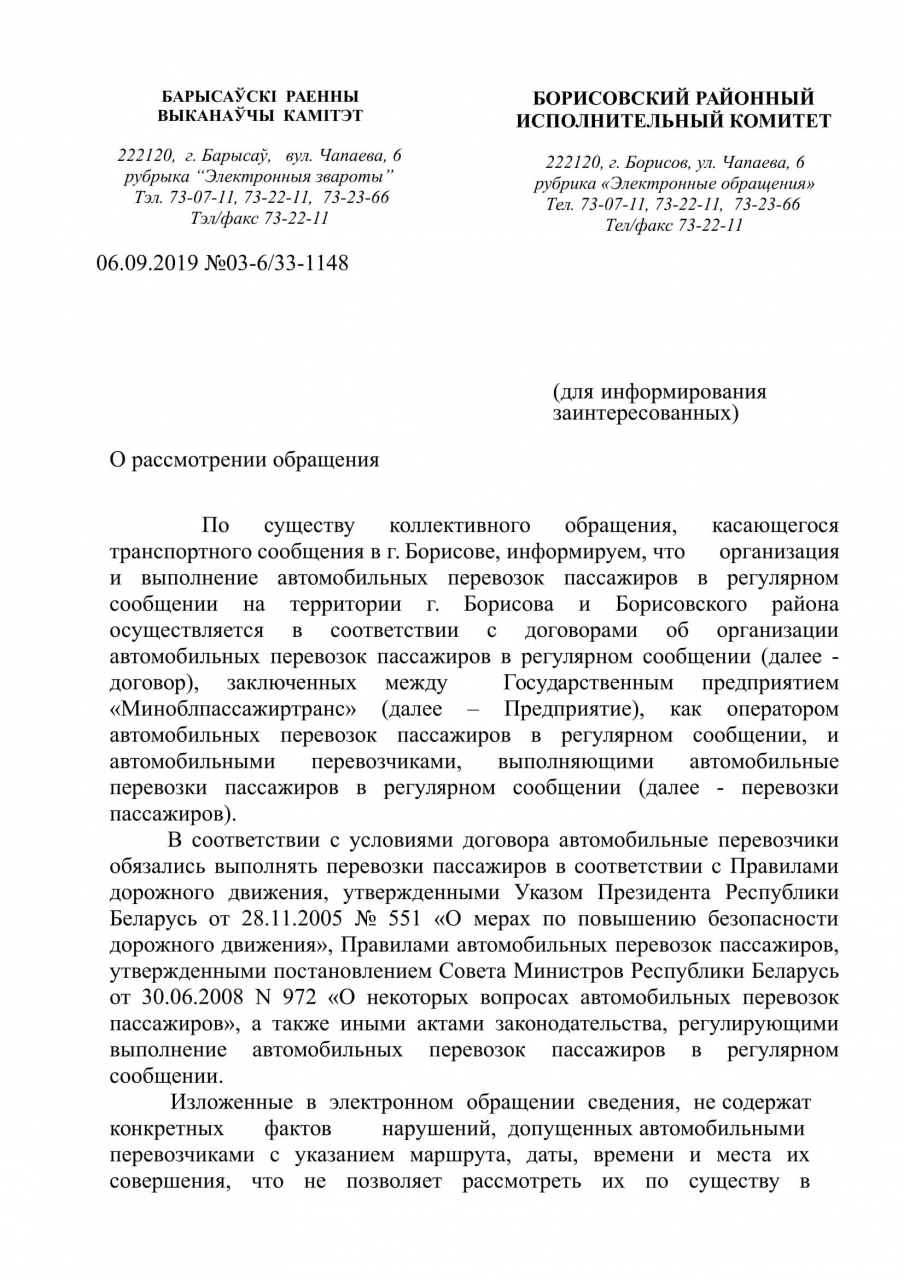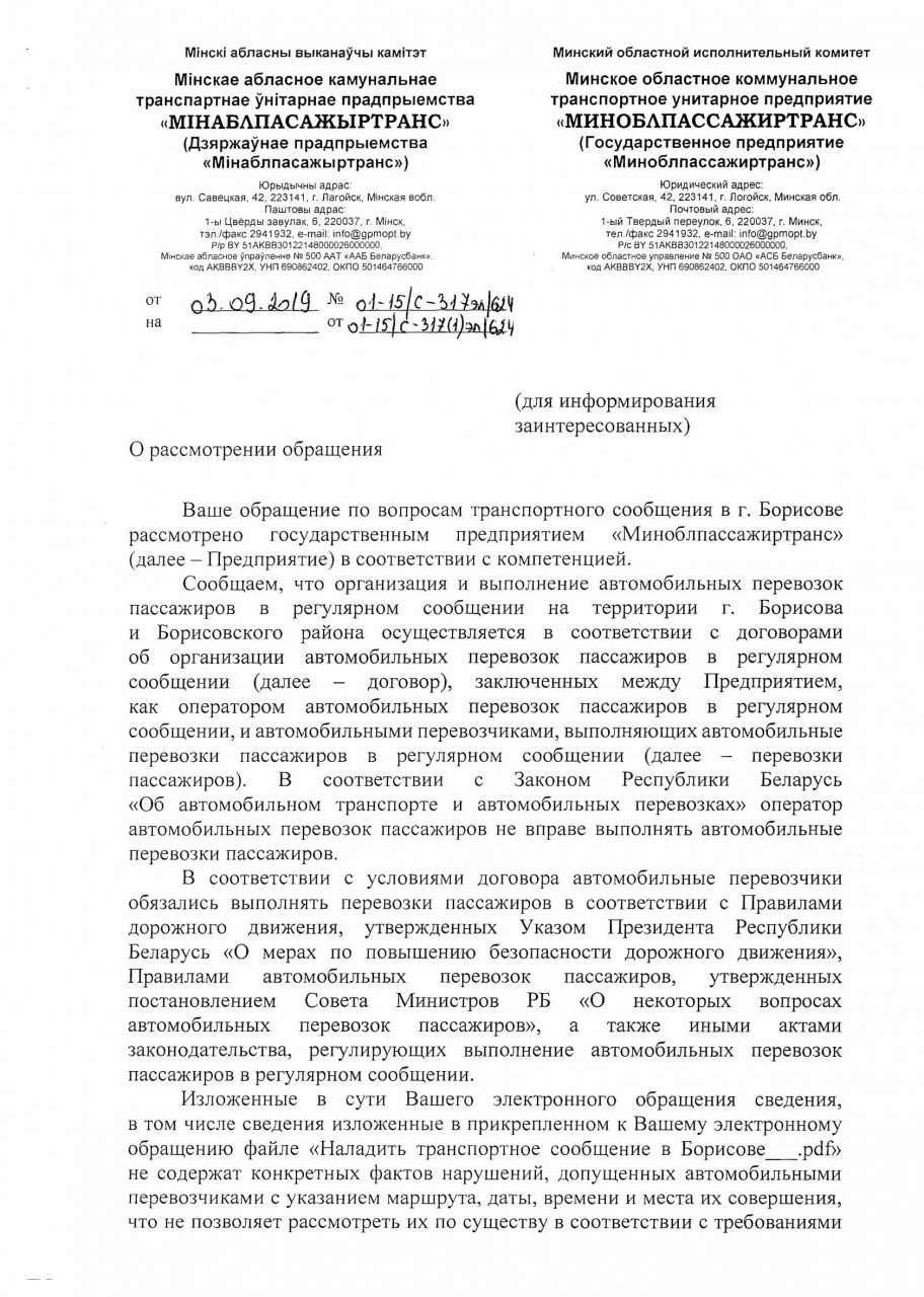 Таким образом, просим принять меры по решению вышеуказанных проблем с транспортным сообщением в городе Борисов.