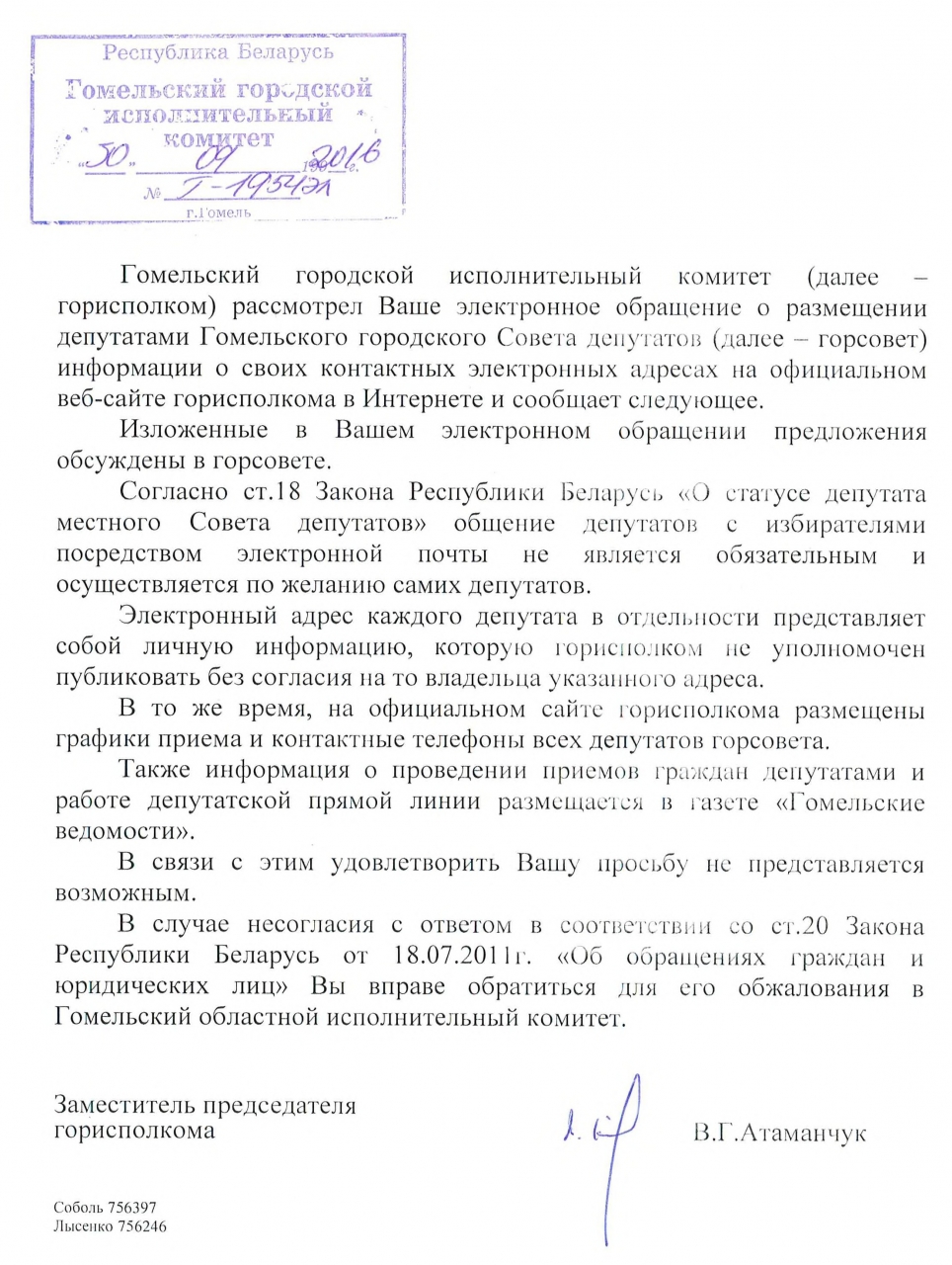 Тем депутатам Гомельского городского Совета депутатов 27-го созыва, которые пока не освоили электронную переписку в глобальной компьютерной сети Интернет, предлагаю разместить вместо адресов своих электронных почт номера своих мобильных телефонов с обязательным указанием операторов мобильной связи.