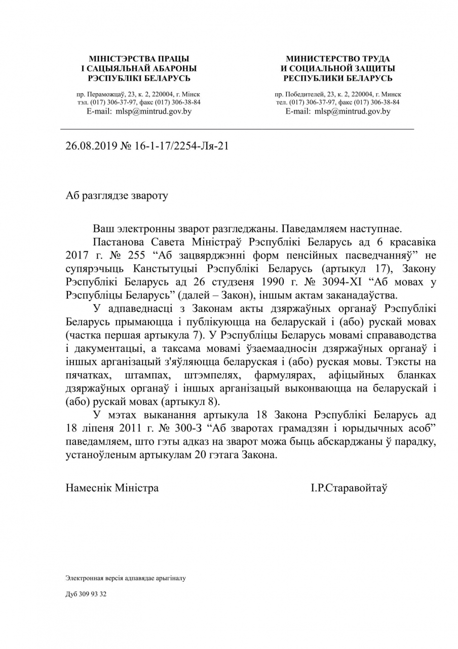 Мы, грамадзяне Рэспублікі Беларусь, патрабуем вярнуць беларускую мову на пенсіённыя пасведчанні, гэтым забяспечыўшы канстытуцыйную роўнасць дзяржаўных моў Беларусі.