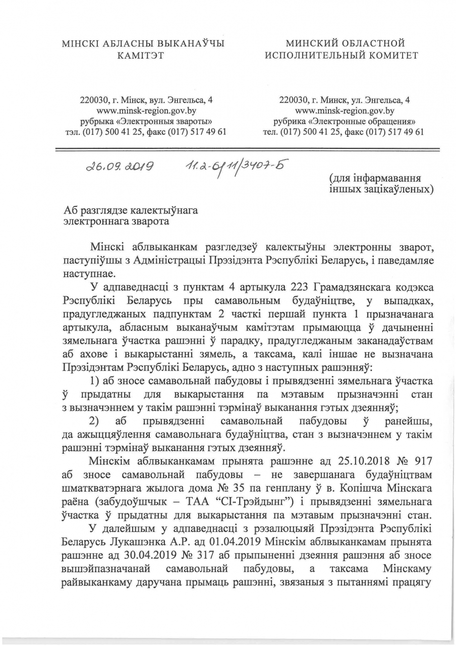 Будаўніцтва названага дома прызнана Мінскім абласным выканаўчым камітэтам і Пракуратурай Мінскай вобласці самавольным на падставе артыкула 223 пункта 1 падпункта 2 Грамадзянскага Кодэкса Рэспублікі Беларусь і паводле пункта 4 падпункта 1 гэтага артыкула Мінаблвыканкамам было вынесена рашэнне №917 ад 25.10.2018 на знос самавольнай будоўлі і прывядзенне надзела ў прыдатны да выкарыстання стан. У далейшым ТАА "СІ-трэйдынг" працягнула будаўніцтва жылога дома на падставе даручэння Прэзідэнта з ўмовай адлічэння часткі прыбытку арганізацыі ад такой будоўлі ў мясцовы бюджэт. З такім рашэннем не згодны, лічым яго незаконным, сыходзячы з наступнага.