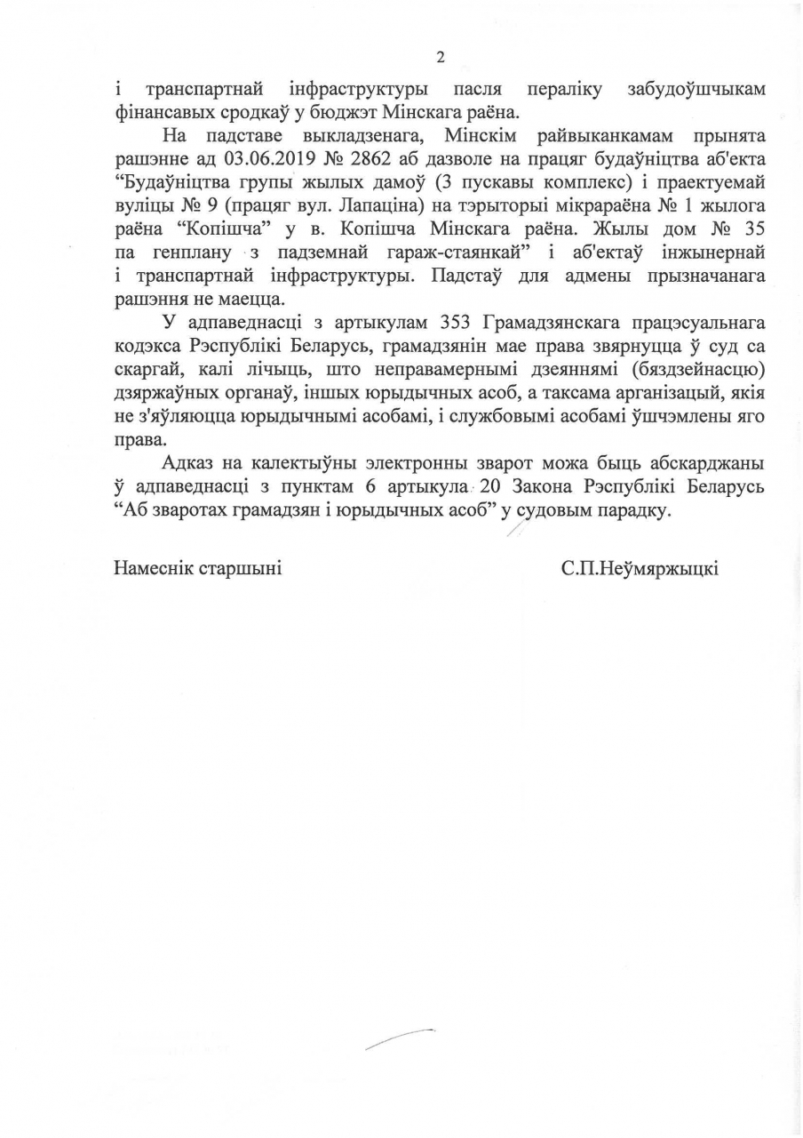 У сувязі з вышэйнапісаным просім адклікаць выдадзены Вамі дазвол на працяг самавольнай будоўлі жылога дома №35 ТАА "СІ-трэйдынг", як незаконны, адмяніць рашэнні, якія былі прынятыя выканкамамі на падставе гэтага дазволу, і тым самым аднавіць законнасць пры будаўніцтве жылого дома №35 у вёсцы Копішча Мінскага раёна.