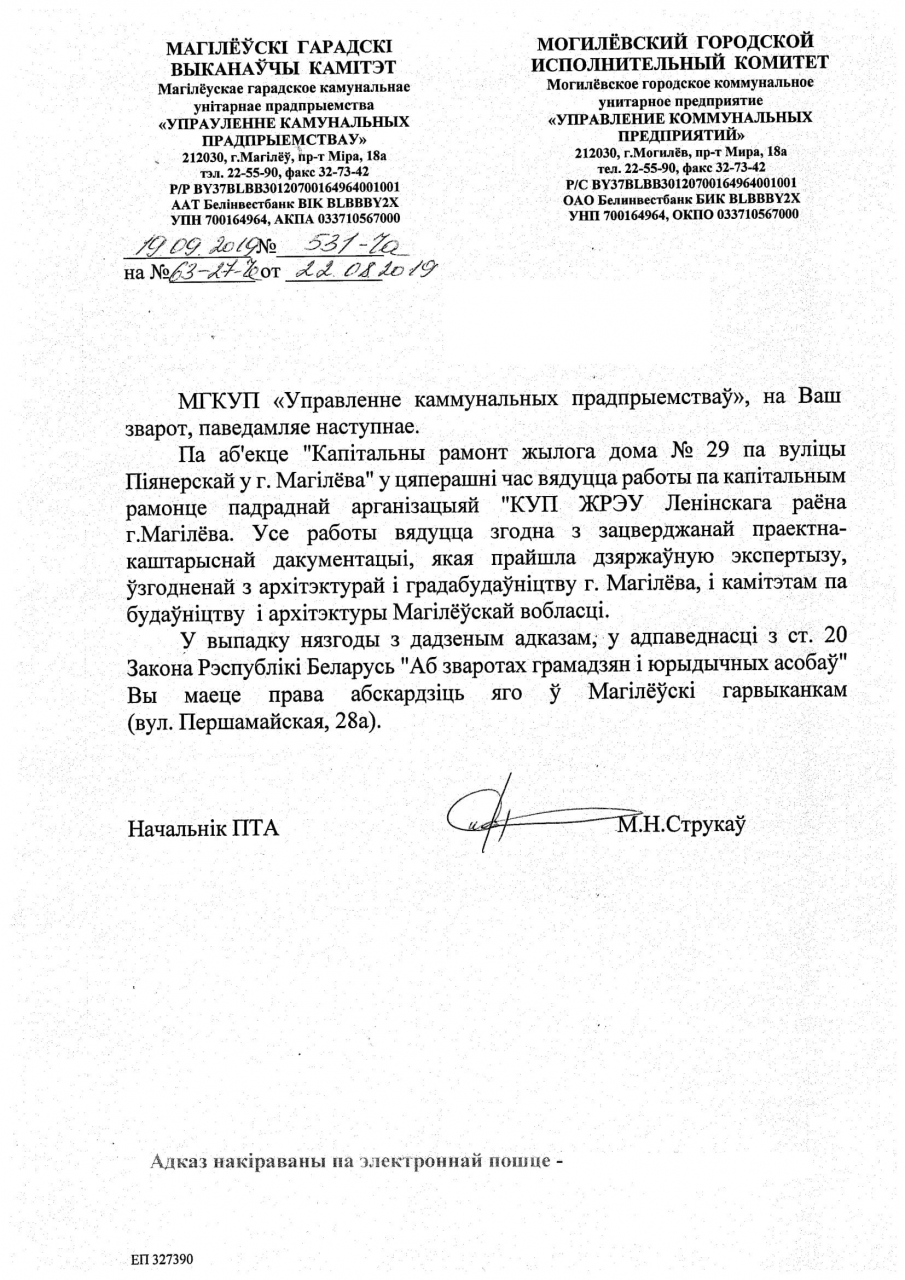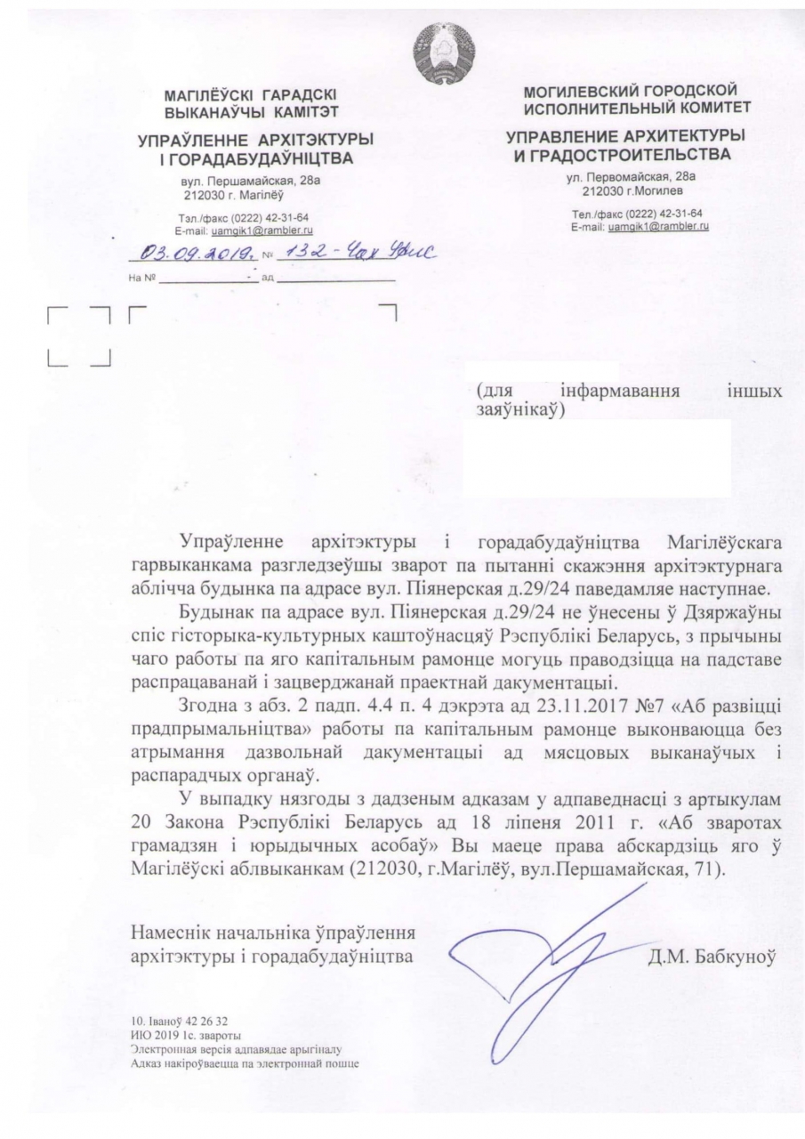Звяртаем Вашую ўвагу на тое, што ў часе рэканструкцыі даху будынка па адрасе вул. Піянерская 29/24 ў Магілёве было неабгрунтавана скажона архітэктурнае аблічча: былі знішчаны элементы атыку (сценкі парапета), які вянчаў рызаліты (невялікія выступы на фасадзе) на галоўным і бакавым фасадах, а таксама рызаліт вуглавой часткі. У выніку парушылася аўтарская задума і кампазіцыйная выразнасць будынка. Пры правільна спраектаваных схілах даху, гэтыя архітэктурныя элементы не маглі быць перашкодай для сцёку вады. Між іншым нагадваем, што будынак быў пабудаваны ў пасляваенны перыяд у стылі савецкага неакласіцызму (больш вядомага як "сталінскі ампір"). Пабудовы таго перыяду з'яўляюцца дастаткова адметнымі па архітэктуры, каб прэтэндаваць на атрыманне статусу гісторыка-культурнай каштоўнасці (у Мінску падобны статус быў нададзены, напрыклад, не так даўно дамам па вул. Якуба Коласа, 38, 40, 42, выкананым у тым жа стылі, і, нават, больш сціплых па сваім архітэктурным вырашэнні), але падобнае непаважлівае стаўленне да працы папярэдніх пакаленняў архітэктараў, ставіць пад пагрозу захаванне відавочна каштоўнай забудовы цэнтральнай часткі горада. Просім аднавіць знішчаныя архітэктурныя элементы.