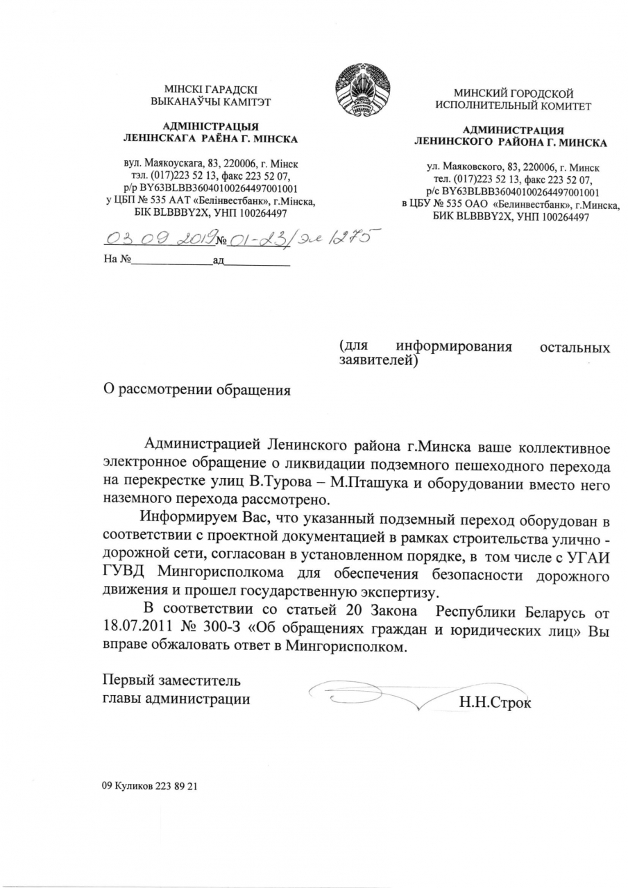 Подземный переход, расположенный на перекрёстке ул.В.Турова-М.Пташука, оборудован в соответствии с проектной документацией в рамках строительства улично-дорожной сети и согласован в установленном порядке для обеспечения безопасности дорожного движения.