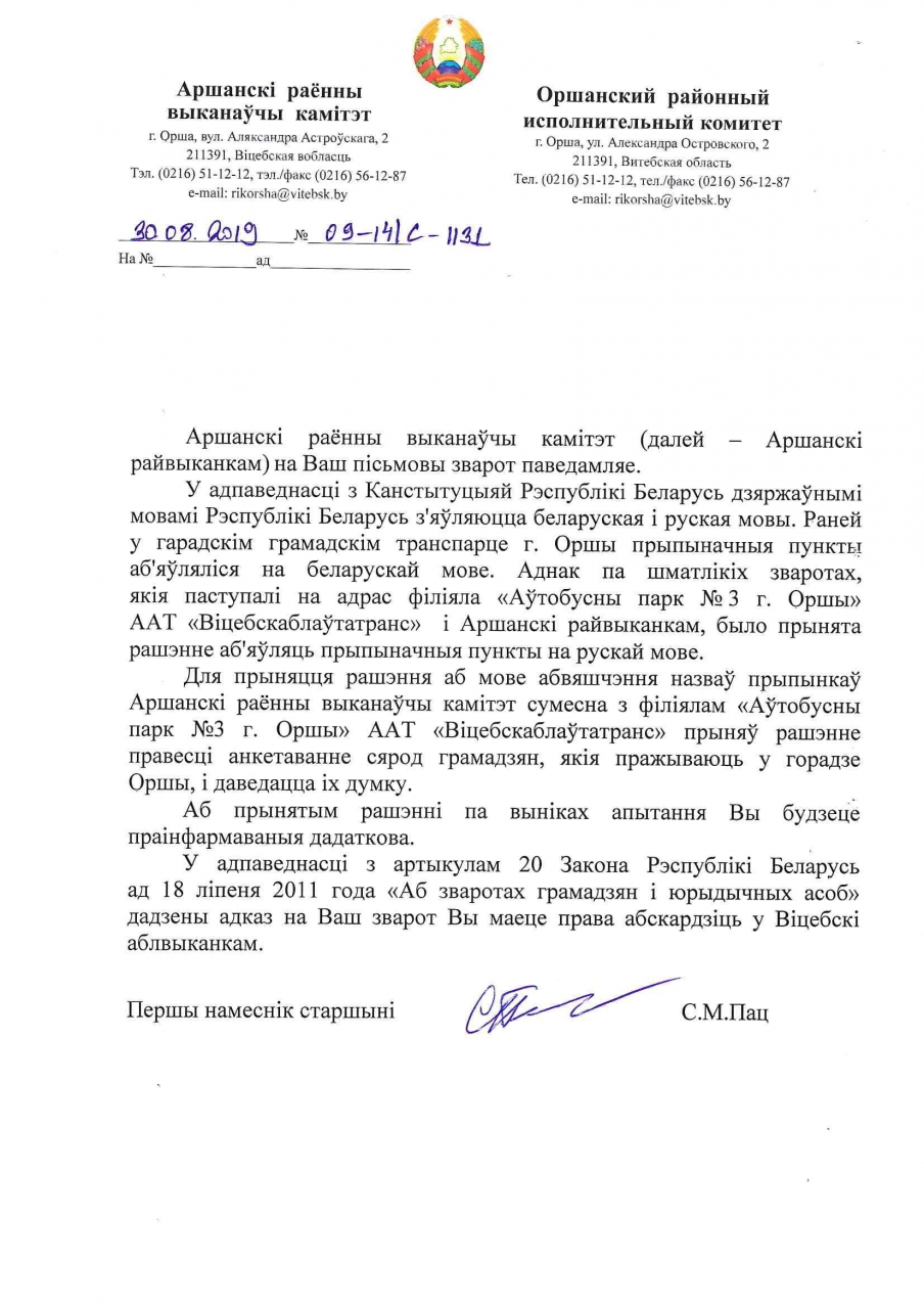 Прынята рашэнне правесцi анкетаванне сярод грамадзян, якiя пражываюць у горадзе Орша, аб мове абвяшчэння назваў прыпынкаў.