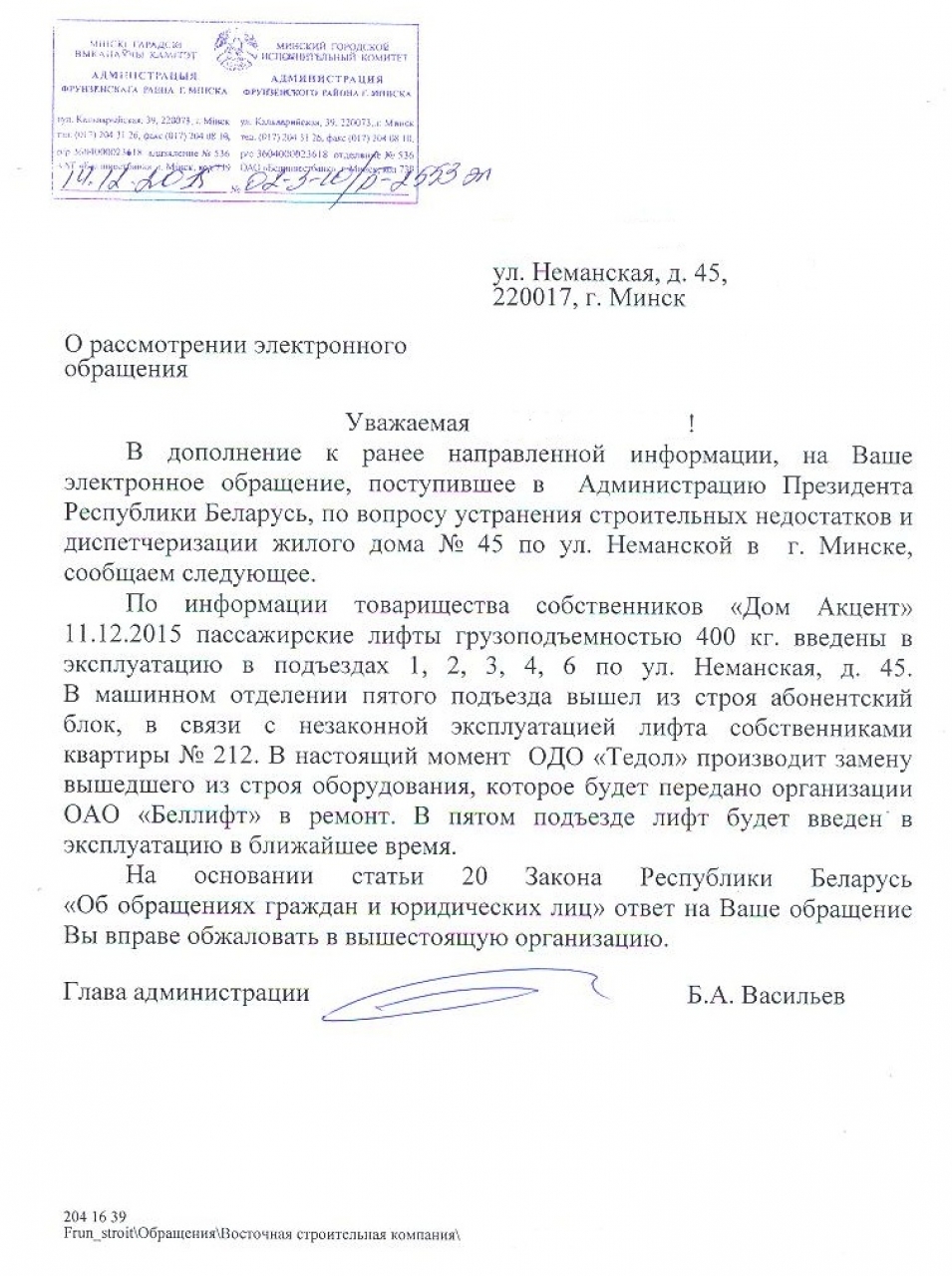 Дом №45 по ул.Неманской в г.Минске был сдан в сентябре 2014 года, но лифты у нас до сих пор не работают. Монтажная организация (Тедол) не закончила монтаж лифтового оборудования. Все вышестоящие инстанции уже "закормили" нас завтраками. Дом строился за собственные средства дольщиков. Администрацией мФрунзенского района было предложено решить проблему за собственные средства. Но ведь мы уже за все заплатили Застройщику ИООО "Восточная строительная компания".