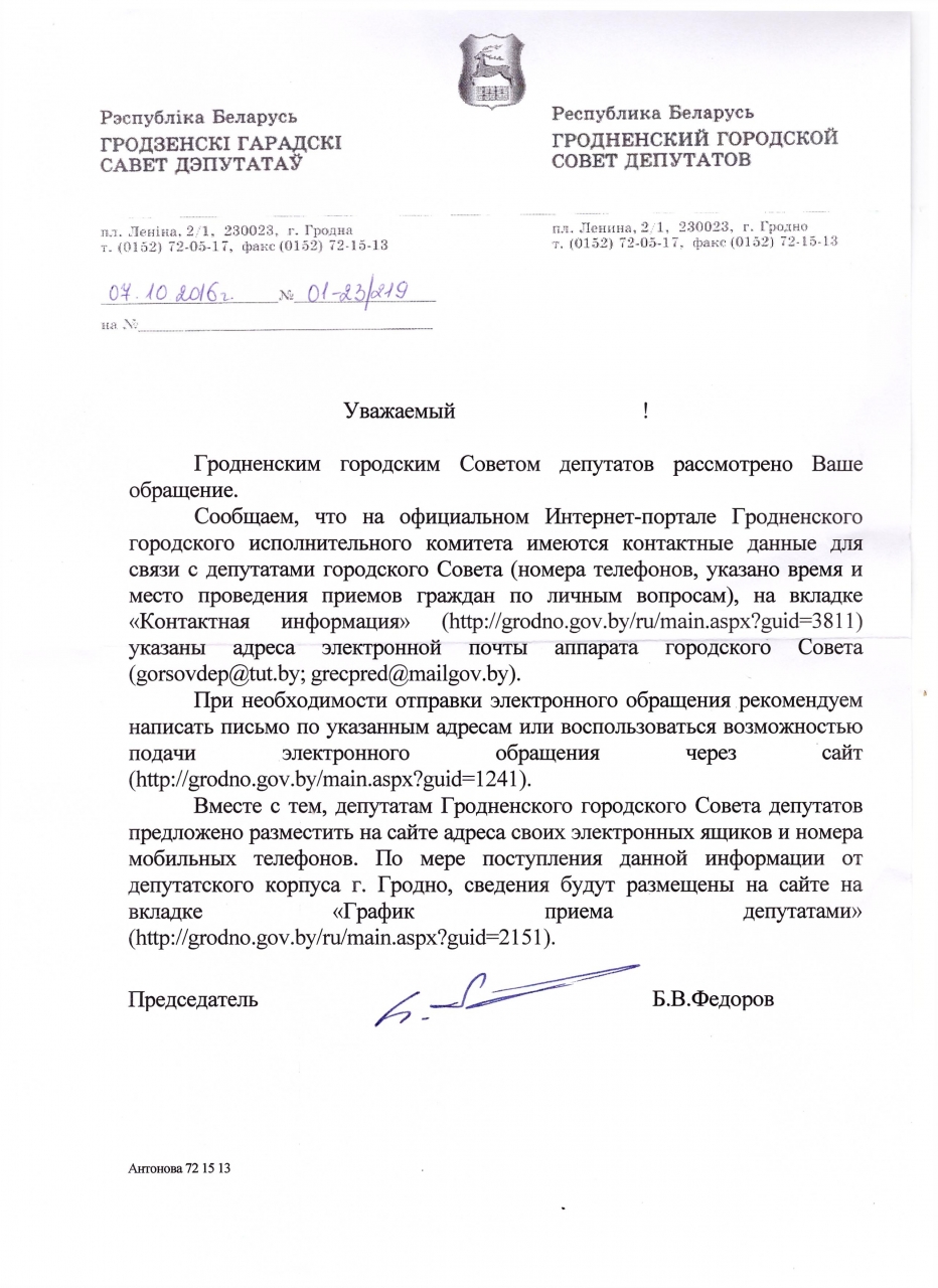 Предлагаю разместить на официальном веб-сайте Гродненского горисполкома до конца 2016 года или в начале 2017 года, на одной из страниц в разделе «Представительная власть», адреса электронных почт всех 29-ти депутатов Гродненского городского Совета депутатов 27-го созыва в качестве одной из новых форм диалога с избирателями и дополнения к личным приемам граждан, городским контактным телефонам депутатов Гродненского городского Совета депутатов, их встречам с избирателями, очередным и внеочередным отчетам по итогам года.