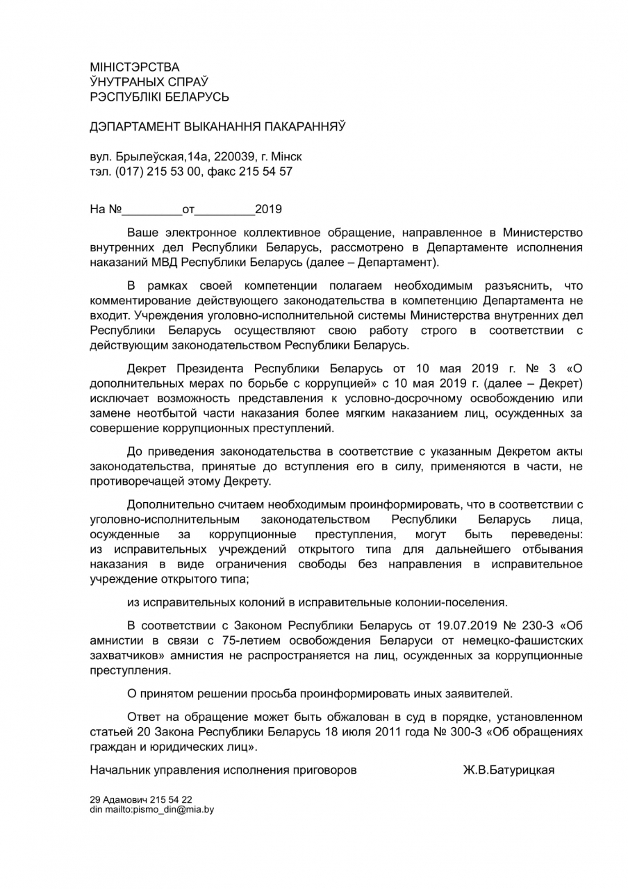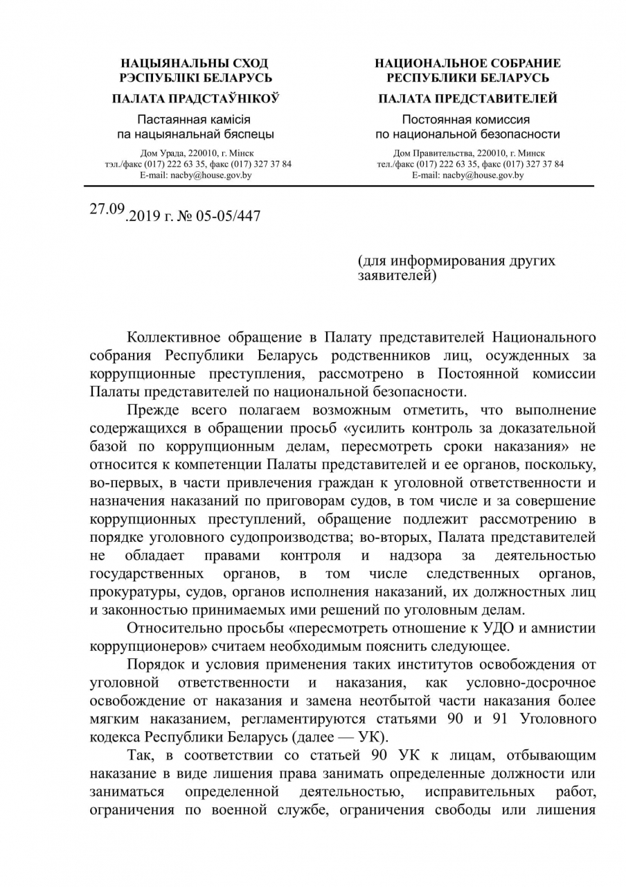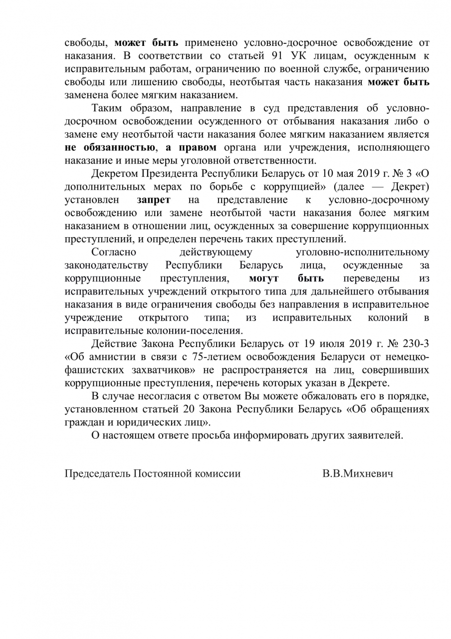 Выполнение содержащихся в обращении просьб «усилить контроль за доказательной базой по коррупционным делам, пересмотреть сроки наказания» не относится к компетенции Палаты представителей и её органов. Декретом Президента Республики Беларусь от 10 мая 2019 г. № 3 «О дополнительных мерах по борьбе с коррупцией» установлен запрет на представление к условно-досрочному освобождению или замене неотбытой части наказания более мягким наказанием в отношении лиц, осужденных за совершение коррупционных преступлений, и определен перечень таких преступлений.