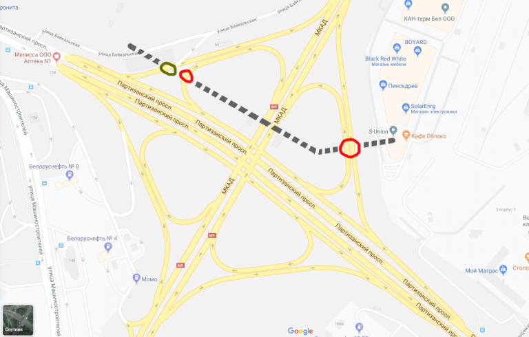 Обращаем внимание на необходимость организации пешеходных переходов на пересечении МКАД и Партизанского проспекта. Огромное количество людей выходят из ст.метро "Могилёвская" и переходят МКАД под мостом к бизнес-центру и производственным зданиям ( отмечено серой пунктирной линией на прилагающейся схеме). Но у людей нет альтернативы перейти дорогу без нарушений (красный круг на схеме) в трёх местах. Причем один пешеходный переход уже есть (зелёный круг на схеме), а дальше уже их нет.
