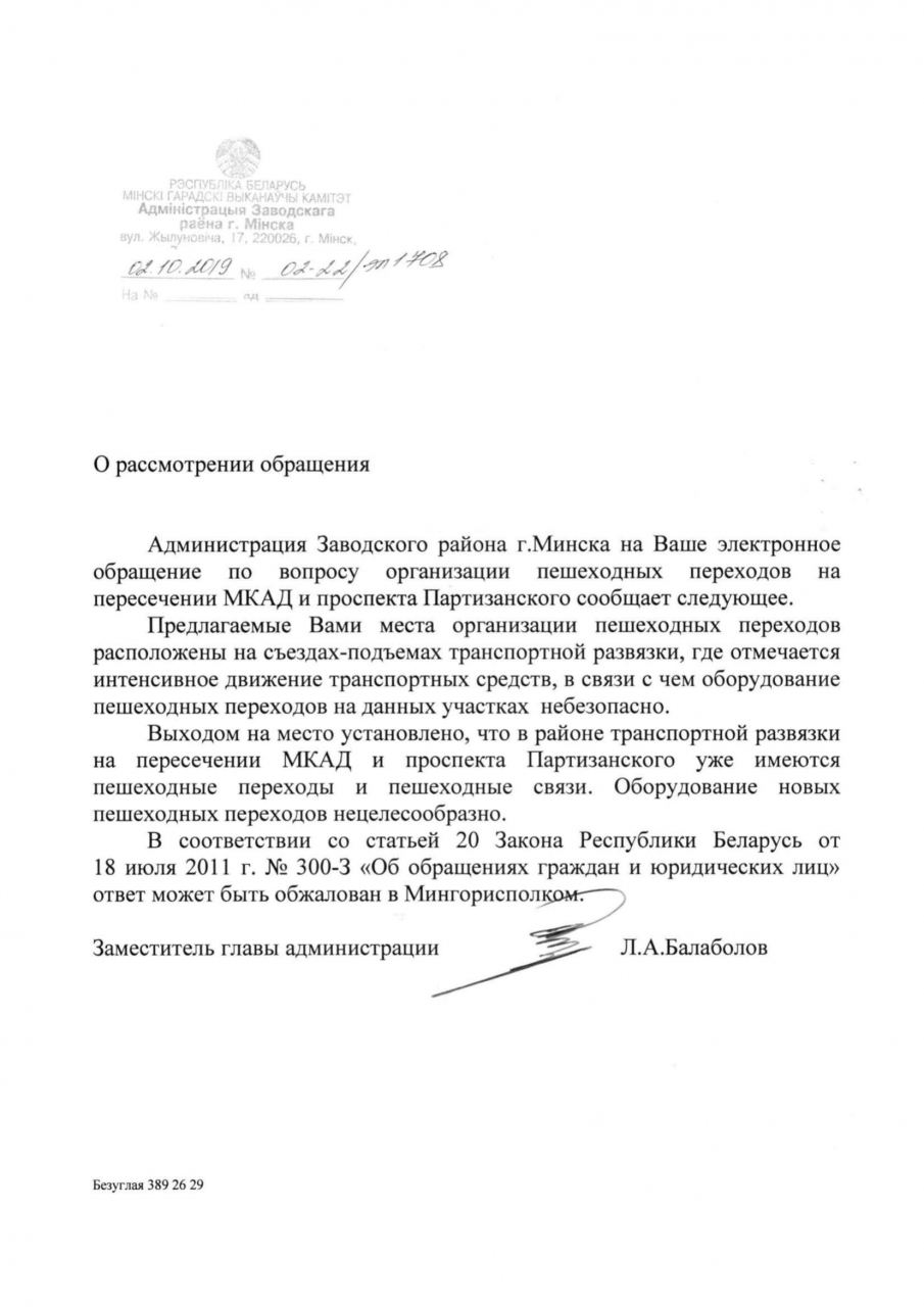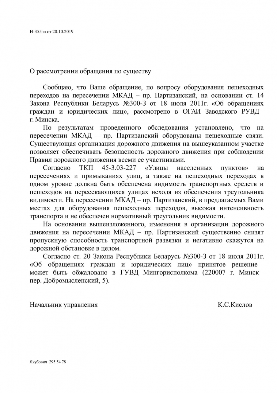 На основании изложенного просим принять меры по организации пешеходных переходов на пересечении МКАД и Партизанского проспекта