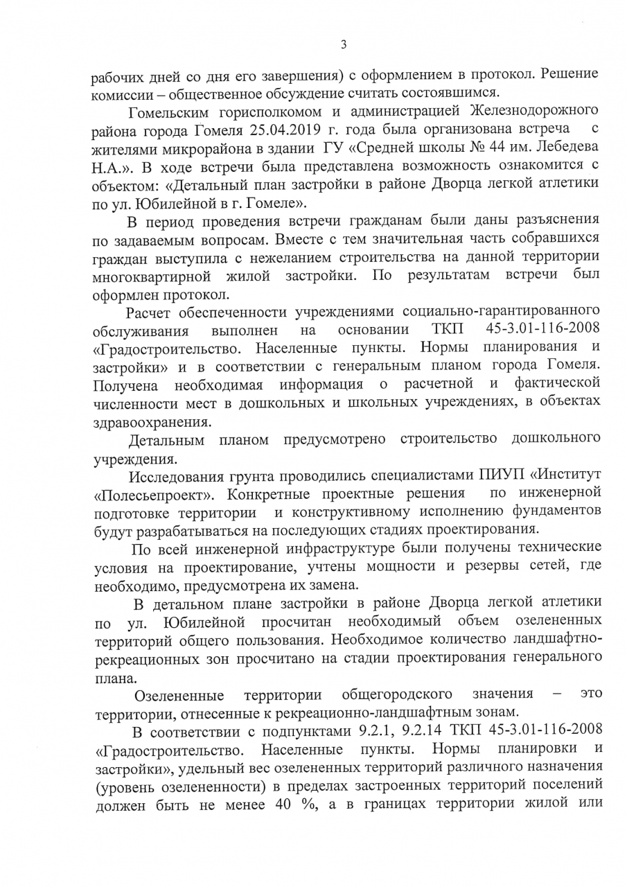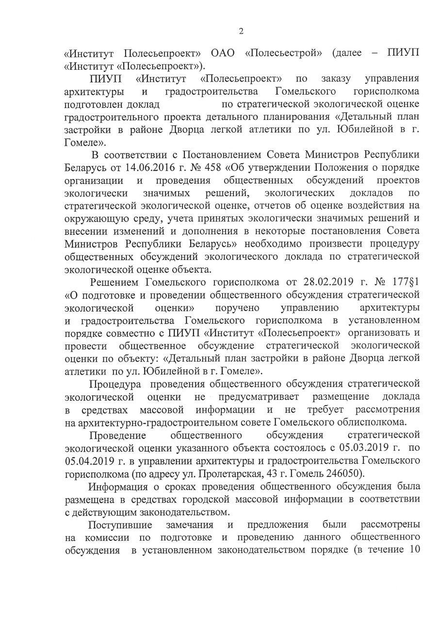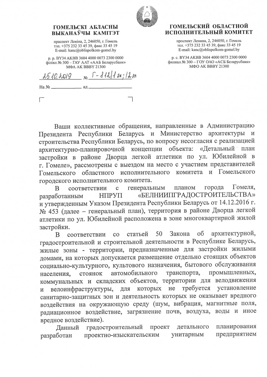 В генплане города Гомеля от 2016 года предлагается существенное изменение зонирования и переход с ландшафтно-рекреационной зоны общего пользования и участка жилой усадебной постройки в многоквартирную многоэтажную жилую зону. А предложенная городскими властями архитектурно-планировочная концепция объекта «Детальный план застройки в районе Дворца лёгкой атлетики по ул. Юбилейной в г. Гомеле» совершенно не приемлема и мы с ней категорически не согласны.