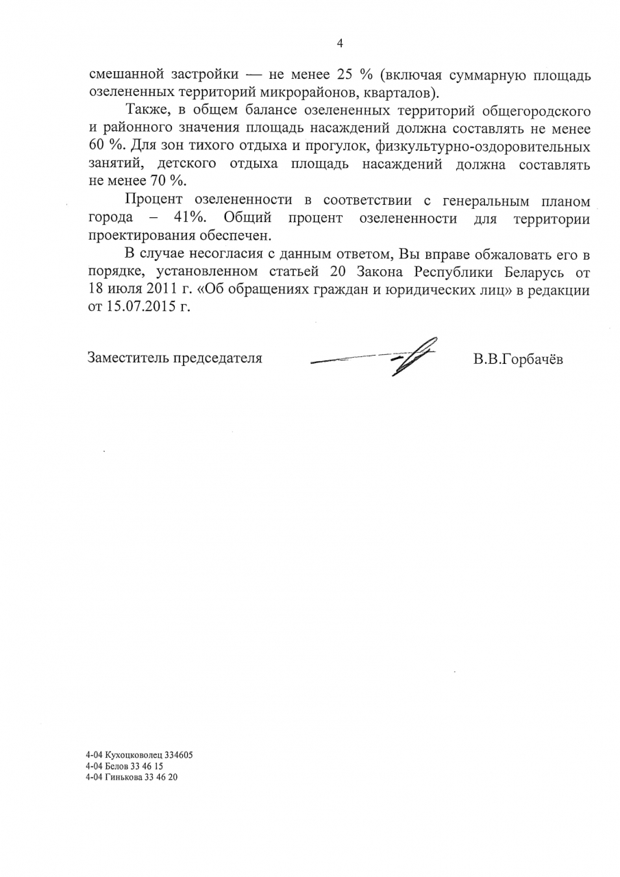 В силу вышеперечисленных фактов у нас, жителей прилегающих домов, которые находятся в непосредственной близости к месту предполагаемой застройки и других граждан, которым небезразлична судьба города, решение властей вызывает глубокое возмущение, так как оно противоречит здравому смыслу и, полагаем, нарушает наши законные права. (Конституция Республики Беларусь статьи 2, 3, 13, 15,21, 29, 44, 46, 48, 53, 54, 55. Закон Республики Беларусь "Об архитектурной, градостроительной и строительной деятельности" №300-З от 05.07.2004 статьи 4, 5, 6, 48, Закон Республики Беларусь "О растительном мире" №205-З от 14.06.2003 ст.7 прим.1, 9, 14 прим.1, 18, 19, 33, 33 прим.1, 34, 35, 36, 37, 55 и другие нормативные акты)