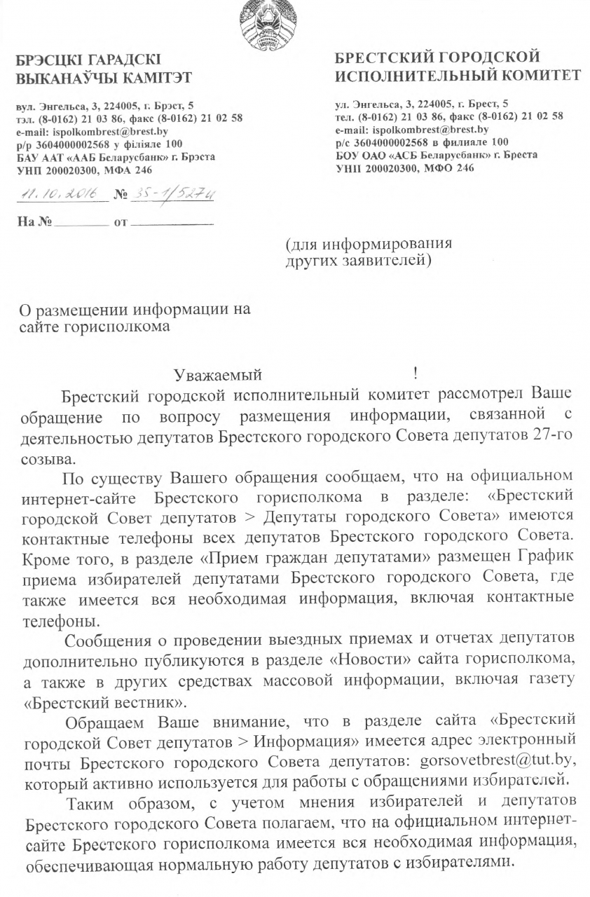 Предлагаю разместить на официальном веб-сайте Брестского горисполкома до конца 2016 года или в начале 2017 года, на одной из страниц в разделе «Брестский городской Совет депутатов», адреса электронных почт всех 40-ка депутатов Брестского городского Совета депутатов 27-го созыва в качестве одной из новых форм диалога с избирателями и дополнения к личным приемам граждан по дополнительной договоренности, городским контактным телефонам депутатов Брестского городского Совета депутатов, их встречам с избирателями, очередным и внеочередным отчетам по итогам года.