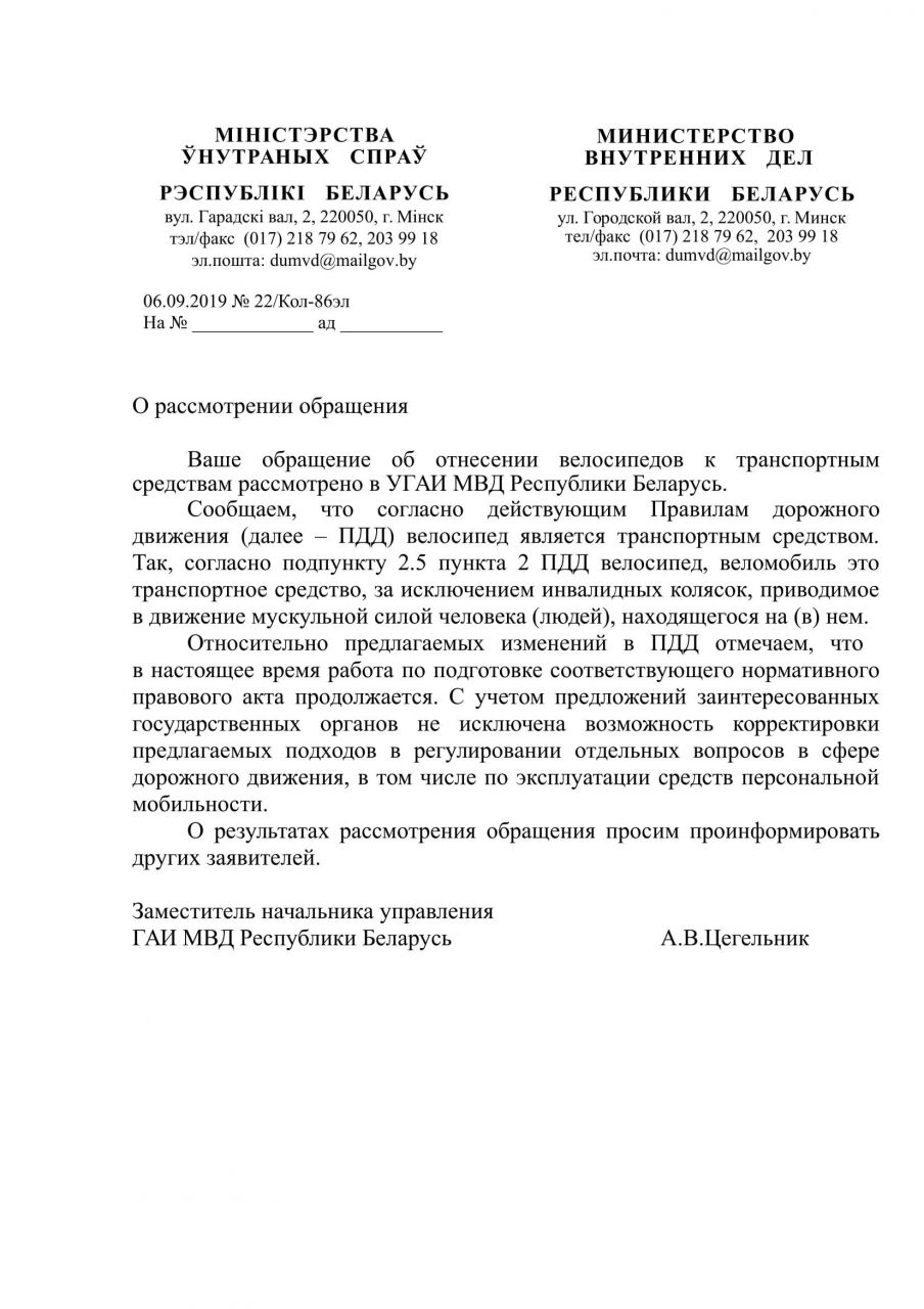 В настоящее время работа по подготовке соответствующего нормативного правового акта продолжается. С учетом предложений заинтересованных государственных органов не исключена возможность корректировки предлагаемых подходов в регулировании отдельных вопросов в сфере дорожного движения, в том числе по эксплуатации средств персональной мобильности.