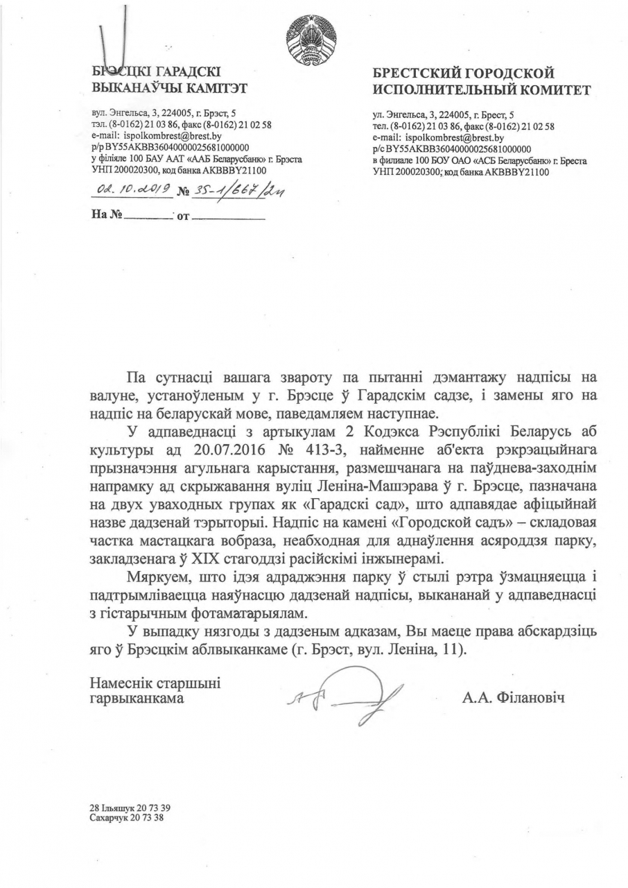 Акрамя таго, улічваючы той факт, што Рэспубліка Беларусь з'яўляецца суверэннай і незалежнай дзяржавай, а гэтак жа тое, што нашай роднай і нацыянальнай мовай з'яўляецца выключна беларуская мова, але пры гэтым ёю валодае малая колькасць беларусаў, просім дэмантаваць надпіс на рускай мове і замяніць яго надпісам на дзяржаўнай мове - беларускай.