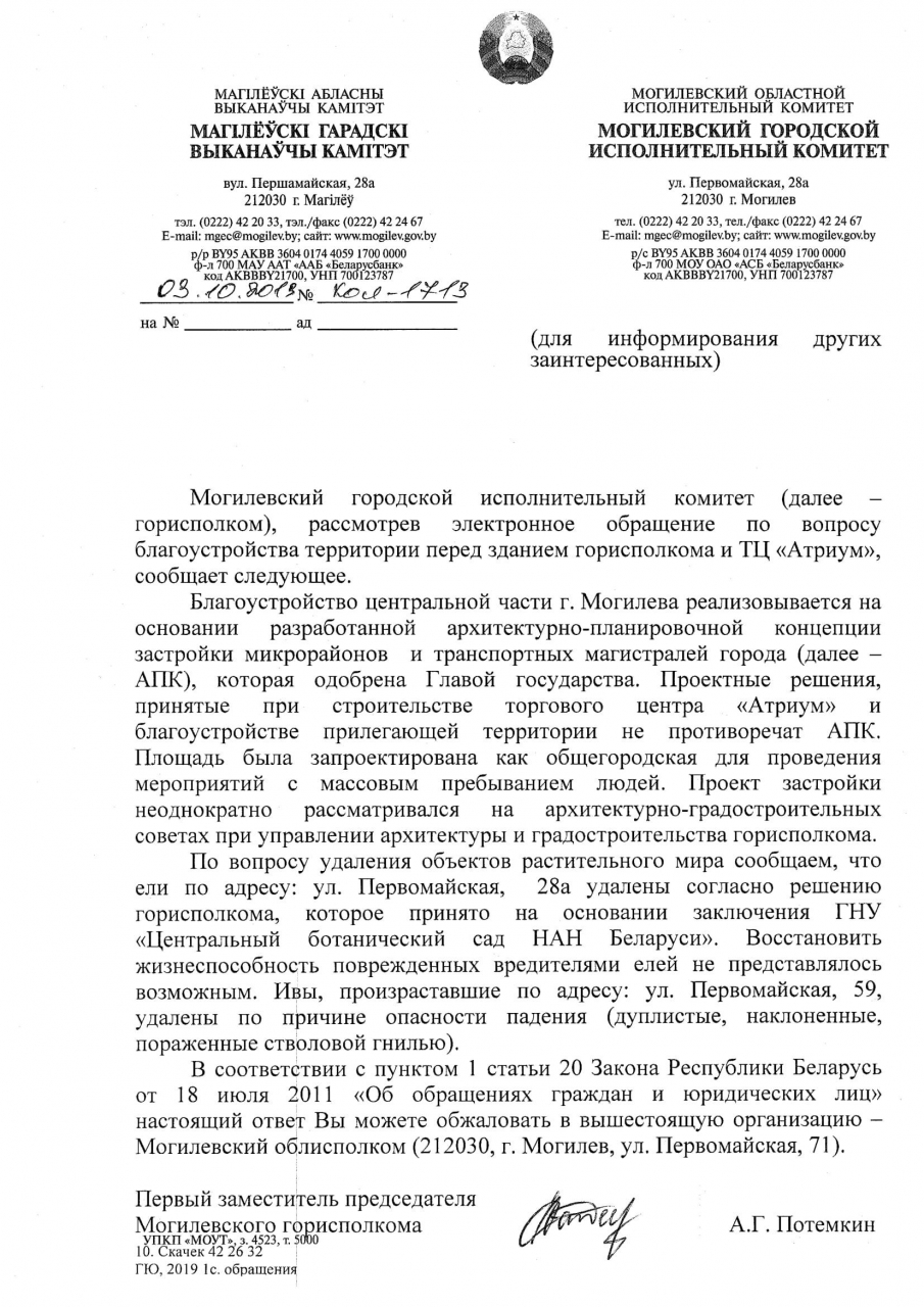 Управление архитектуры и градостроительства Могилёвского горисполкома просит заявителей принять участие в собрании, которое состоится 3 октября в 15.00 в 320 каб., по вопросу благоустройства площади напротив Могилёвского горисполкома .