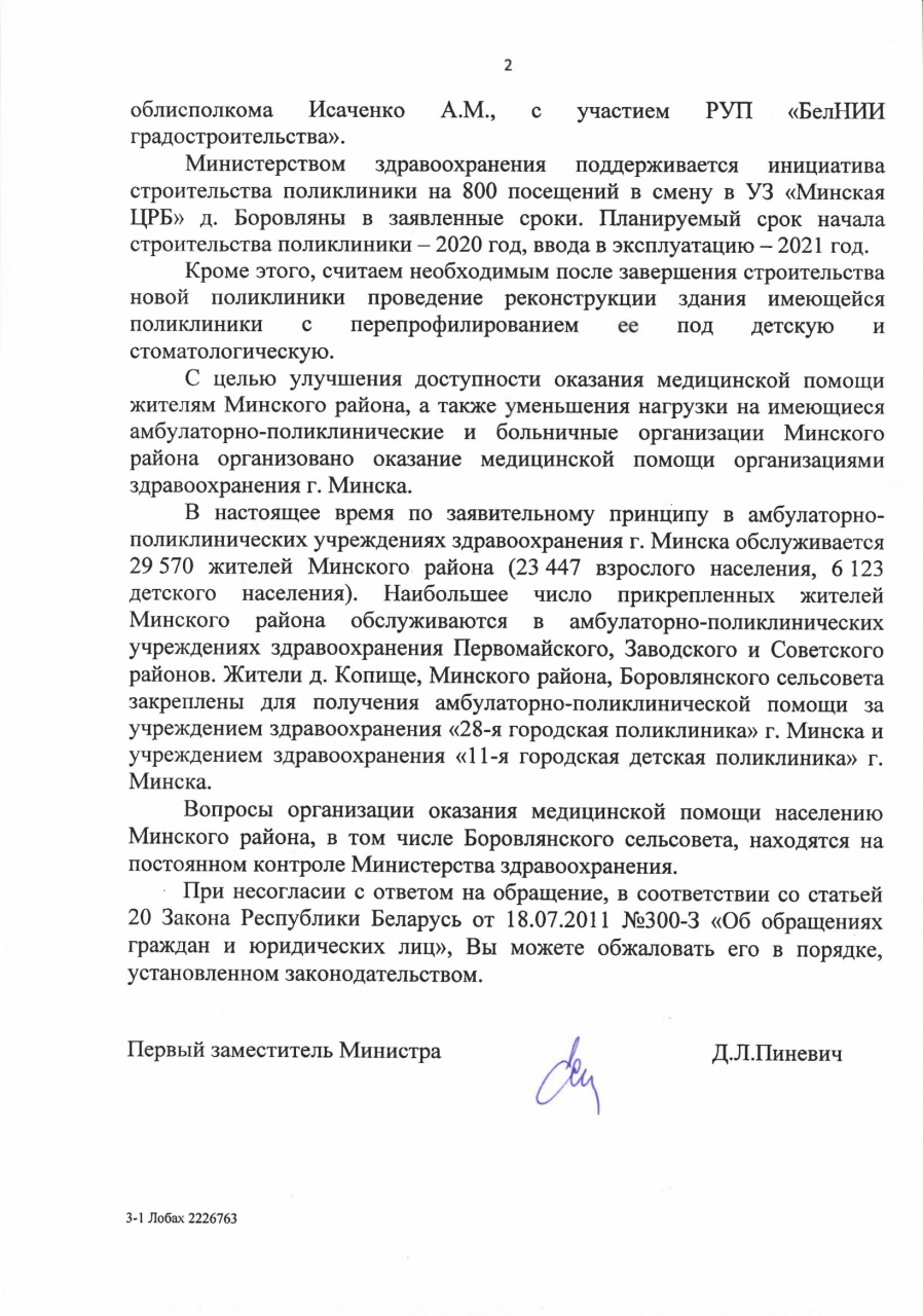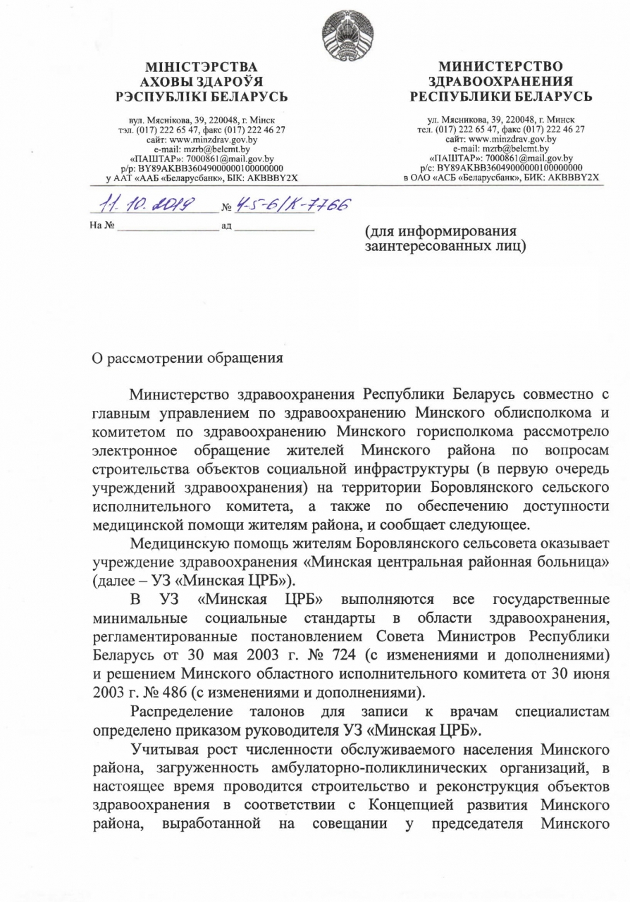 В 2018 году был достроен новый терапевтический корпус УЗ «Минская центральная районная больница» (далее – МЦРБ). Однако вопрос с увеличением мощности поликлиники МЦРБ до сих пор не решен. С учетом того, что население Минского района на сегодня составляет более 200 000 чел., а согласно данным Боровлянского с/с с учётом дальнейшего строительства жилых домов в ближайшие два года планируется увеличение населения только на территории Боровлянского с/с предположительно еще на 10 000 чел., то очевидно, что вопрос с оказанием населению Минского района медицинской помощи в амбулаторных условиях не только не решается, но еще более усугубляется.