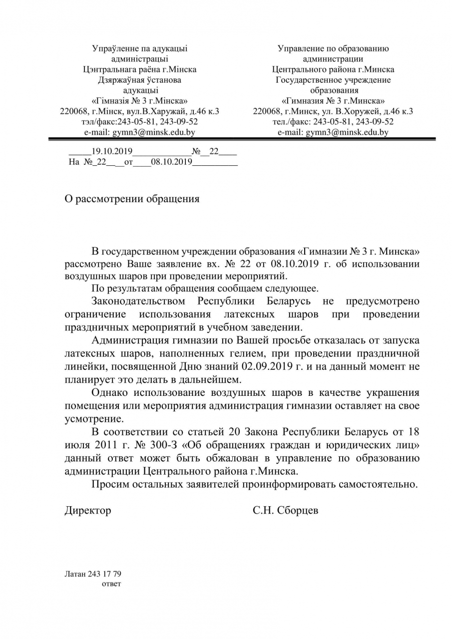 Администрация гимназии отказалась от запуска латексных шаров, наполненных гелием, при проведении праздничной линейки, посвященной Дню знаний 02.09.2019, и на данный момент не планирует это делать в дальнейшем.