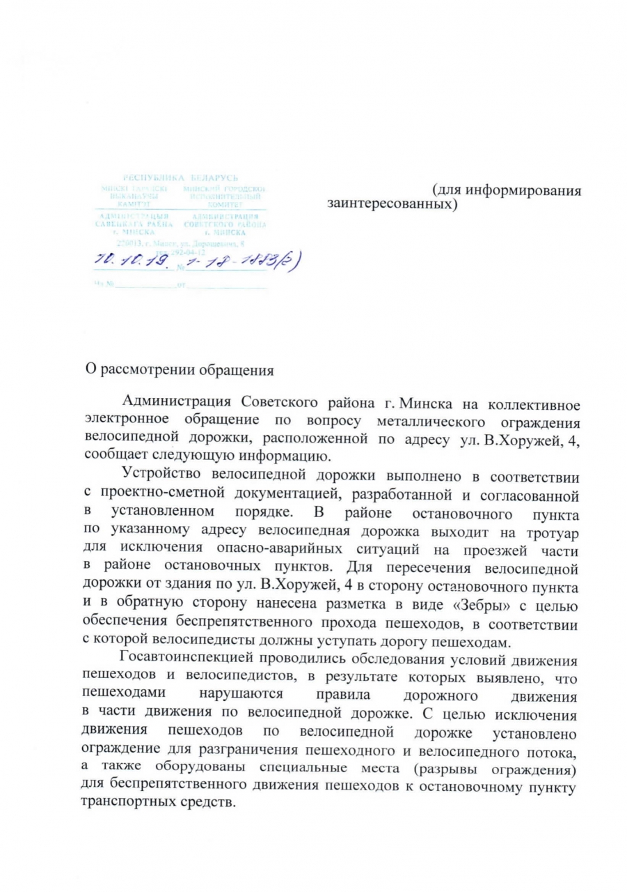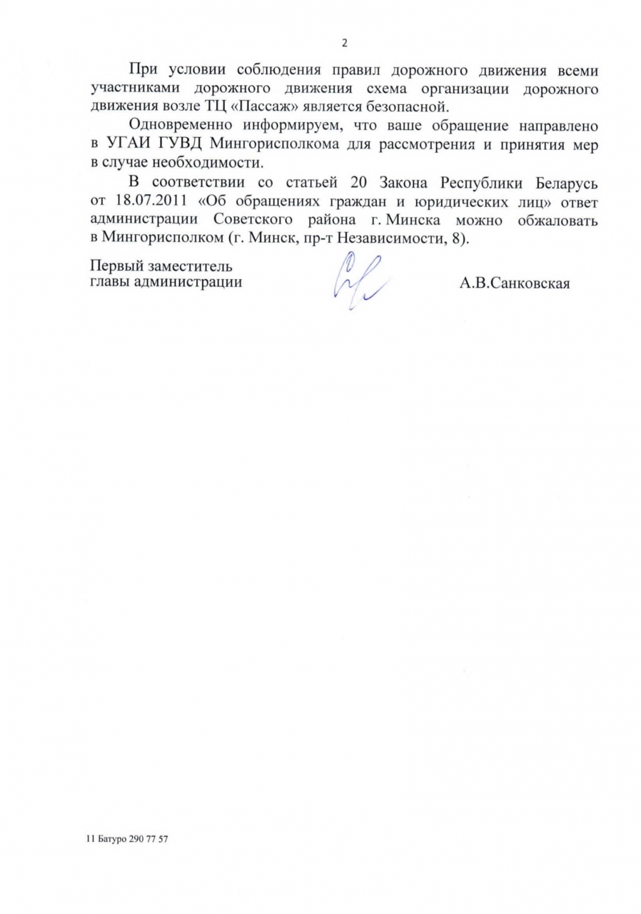 При соблюдении ПДД всеми участниками дорожного движения схема организации дорожного движения возле ТЦ "Пассаж" является безопасной. Обращение также направлено в УГАИ ГУВД Мингорисполкома для рассмотрения и принятия мер в случае необходимости.