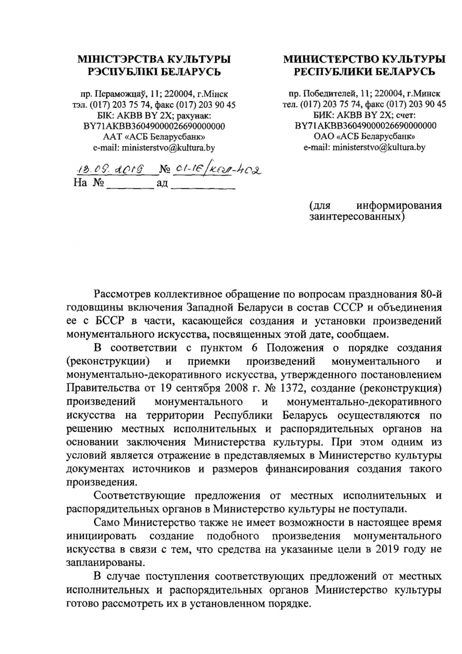 У сувязі з асаблівай важнасцю, на нашу думку, гэтай падзеі для кожнага беларуса мы просім разгледзець магчымасць увекавечыць памяць гэтай падзеі з дапамогай устаноўкі аб'ектаў манументальнага мастацтва: помнік гістарычнай падзеі; памятны знак (стэла, абеліск і іншыя архітэктурныя формы), а таксама шляхам прысваення імя «17 верасня» аб'ектам інфраструктуры населеных пунктаў: праспекты, вуліцы, паркі, скверы.