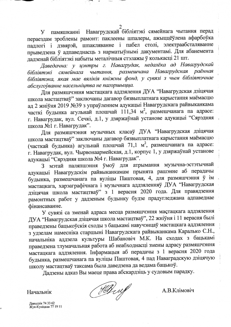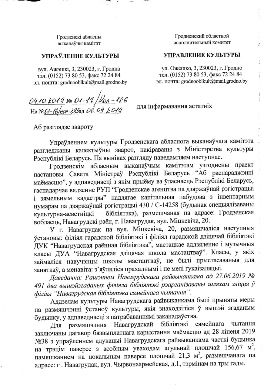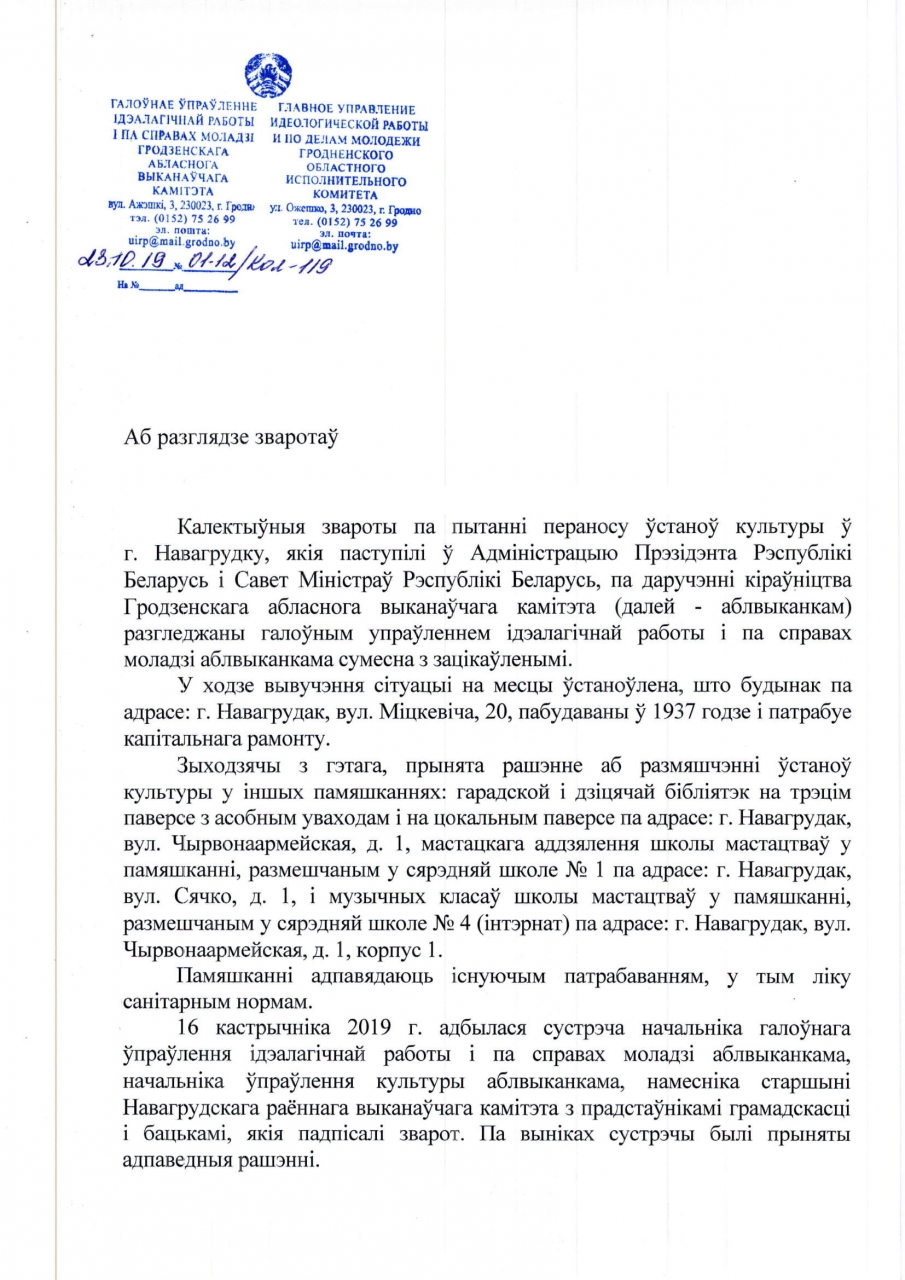 У афіцыйным ліставанні, Наваградскі выканкам запэўніваў, што ўлічвае інтарэсы ўсіх зацікаўленых бакоў, але выглядае на тое, што зацікаўленым бокам выканкам ліча толькі сябе і арганізацыю БТІ, а бацькі 150 навучэнцаў мастацкай і музычнай школы - быццам не людзі, як зрэшты і супрацоўнікі ўстаноў, як і 5,6 тысяч чытачоў бібліятэкі, бо іх згода і довады выканкаму насамрэч не патрэбныя. Меркаванне людзей не бярэцца ў разлік, бацькоў школ не слухаюць, чытачоў бібліятэкі ўвогуле не спыталі.