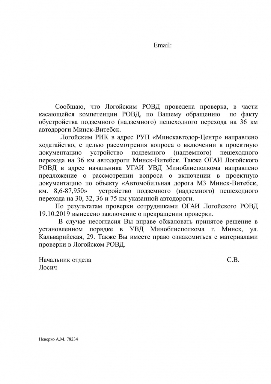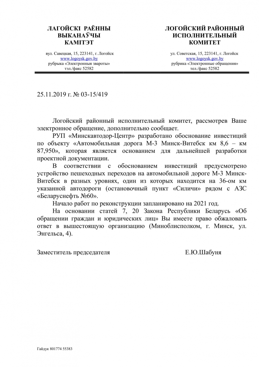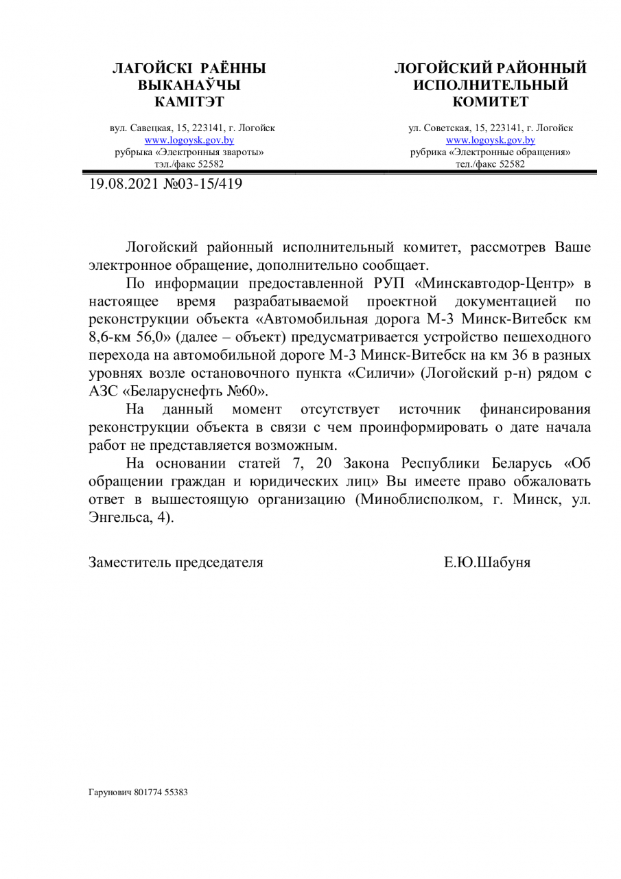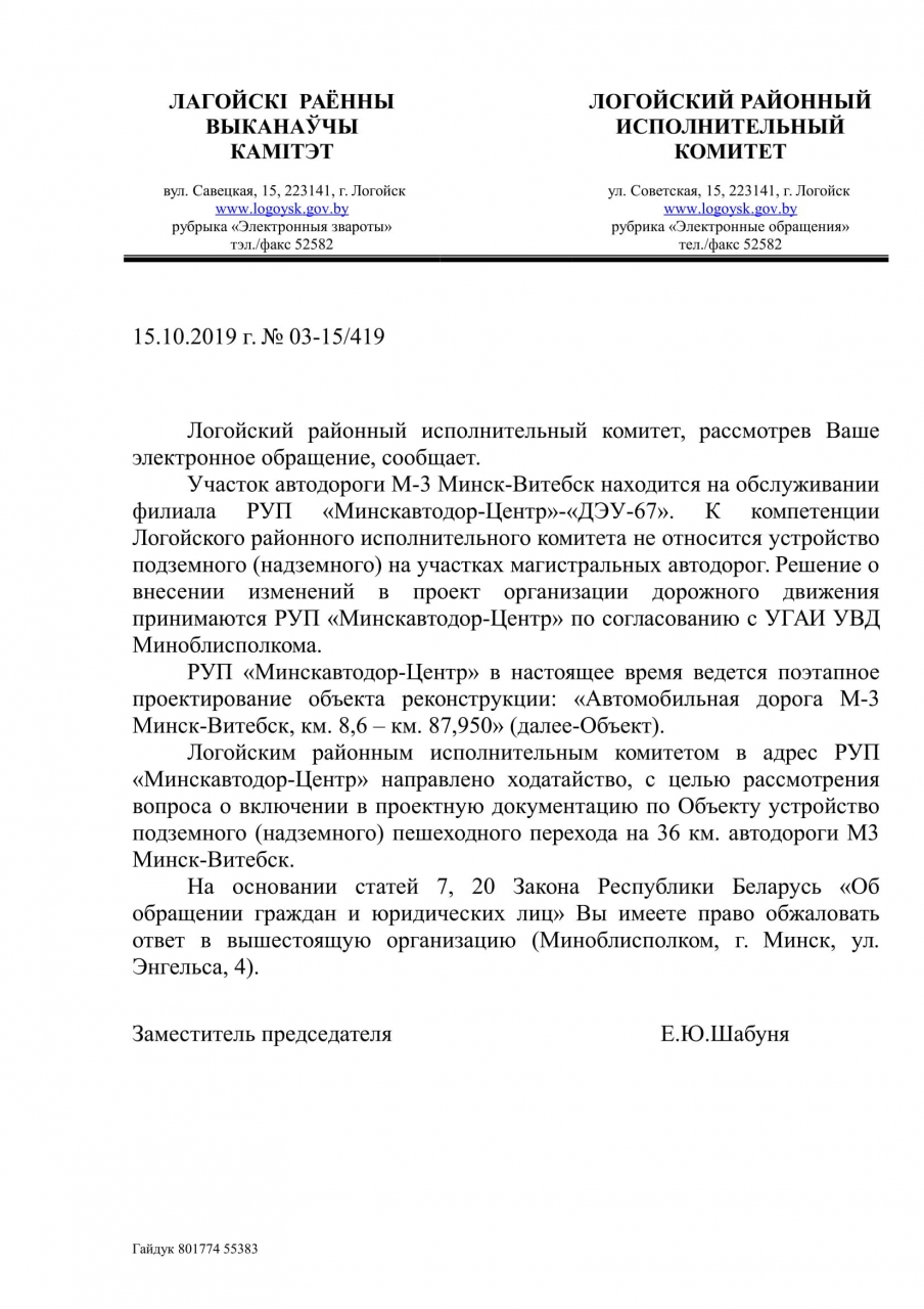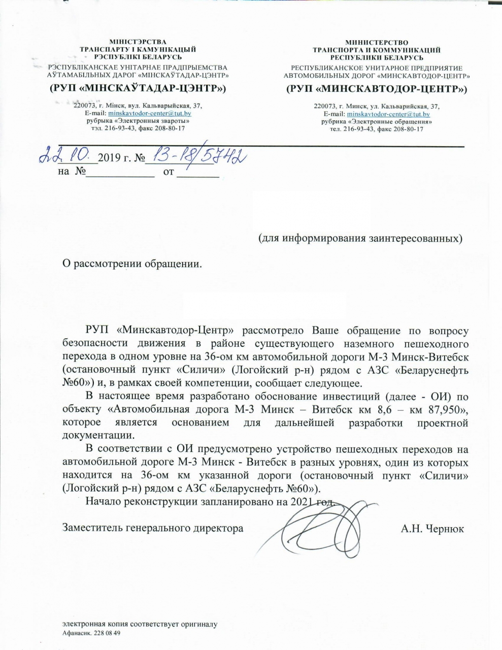 В адрес РУП «Минскавтодор-Центр» направлено ходатайство, с целью рассмотрения вопроса о включении в проектную документацию по объекту «Автомобильная дорога М-3 Минск-Витебск, км. 8,6 – км. 87,950» устройства подземного (надземного) пешеходного перехода на 36 км. автодороги М3 Минск-Витебск.